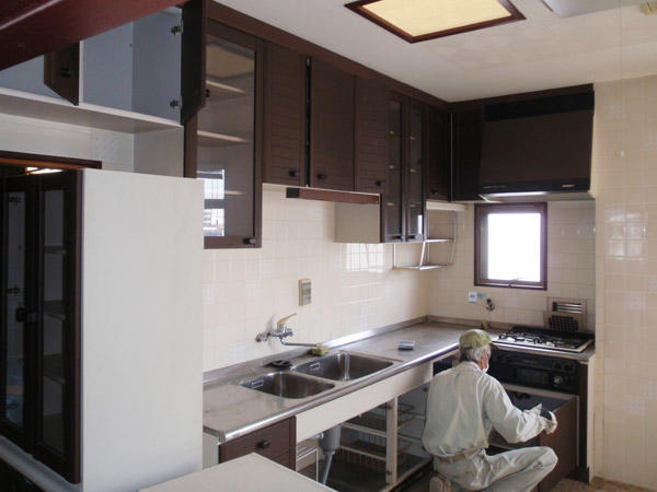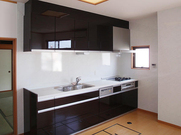 全室リフォームに伴い、L型のシステムキッチンをI型にリフォームしました。場所を取らずにスッキリと収まった新しいキッチンは食器洗い乾燥機もビルトインされており、お客様にも大変喜んで頂くことが出来ました。足元には床下収納庫も取り付けさせて頂き、I型になっても収納力はバッチリ確保♪