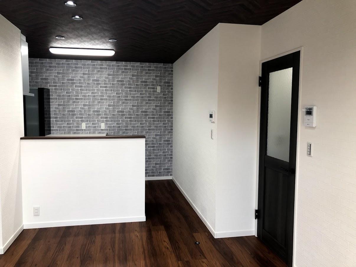 老朽化して使い勝手の悪い自宅を新築レベルにリノベーションしました!今回はリノベーションの一部、和室だった居間からキッチン&書斎付きリビングをご紹介します。お客様のご要望でカウンターキッチンを設置。使い勝手が良くなり、レンガ調のアクセントクロスは立体的でキッチンをオシャレに際立たせます。黒いドアと合わせることで、シックでカッコイイ雰囲気に変身!お客様のご希望が叶い、大満足のリノベーションになりました。