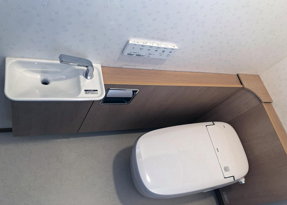 手洗い付トイレではお子様が手を洗う際に水が飛び散るとの事で取替えさせていただきました。 LIXIL サティスG手洗器付 サティスGはタンクレスで奥行がコンパクトなので、タンク付きトイレからリフォームすると広々空間に! トイレを脱着するのでCFの貼り替えを提案させていただきました。