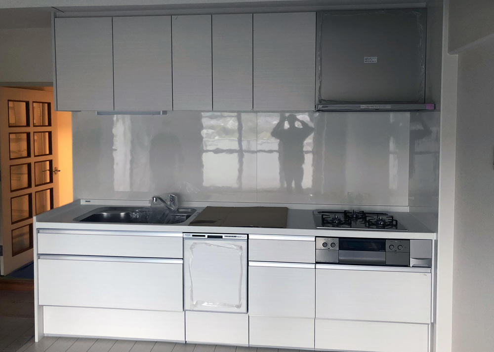 施工前は食器洗い乾燥機がなく、壁面タイル張りでお手入れが大変との事でした。 施工後はホワイトで統一した清潔感あるシステムキッチンに仕上がりました。