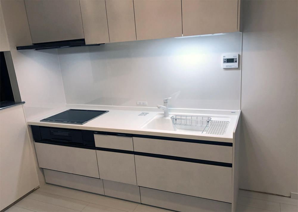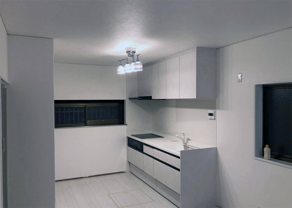 LDKのリフォームをさせていただきました。 キッチンはPanasonicのラクシーナを採用しました。 フローリングを上張りして部屋全体のクロスを張替えて白を基調とした仕上がりになっております。 またキッチンの位置を変更したことで部屋がより広く感じられるようになりました。