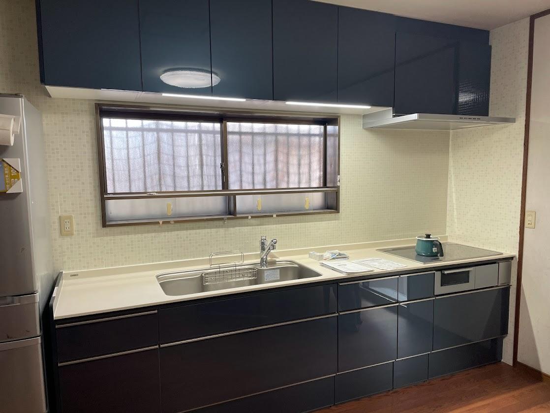 お客様のご要望で3口フルIHヒーター、幅広のシンクを採用しました。 たくさんの収納でスッキリ片付くキッチンです。