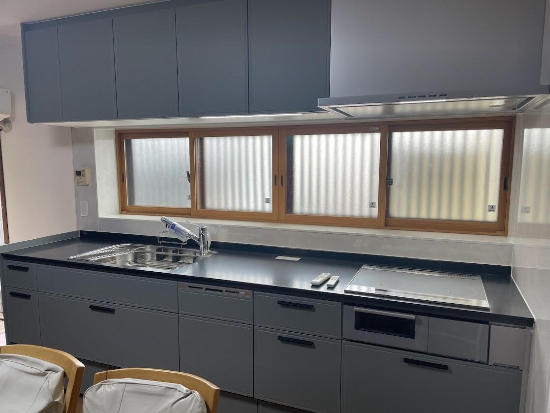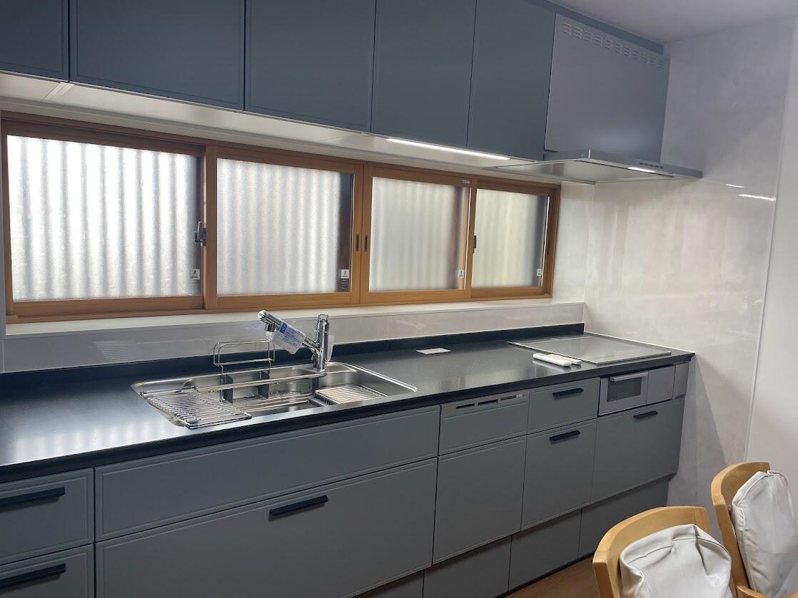 キッチンは『ノクト』を採用し、シックな色味に合わせてワークトップはブラックストーンの人造大理石にしたかっこいいキッチン。