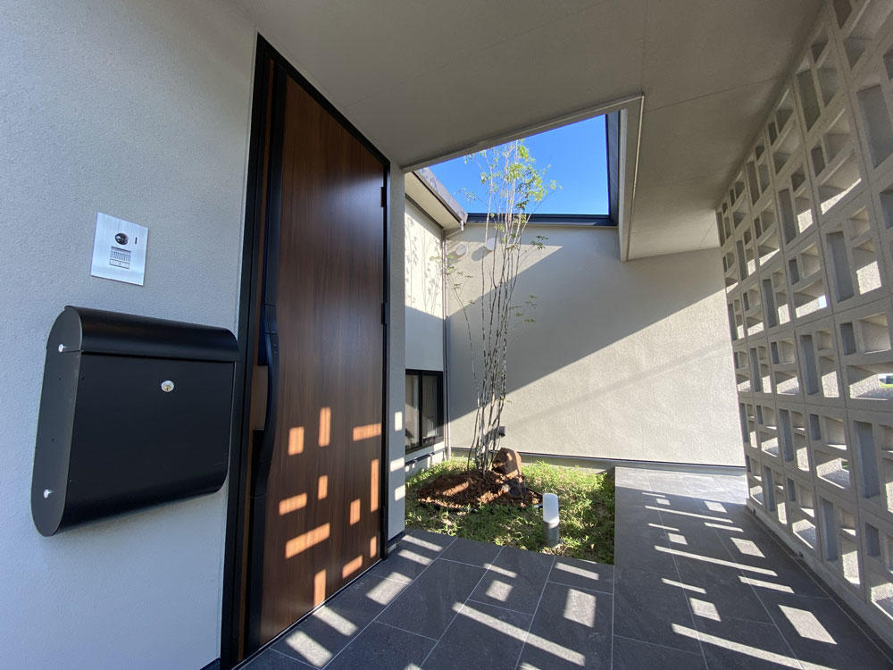 新築工事後に追加した外構工事です。大屋根の家と自然が豊かなゆったりした立地が生きる玄関まわり・植栽プラン・タイルデッキ配置を特に工夫しました。