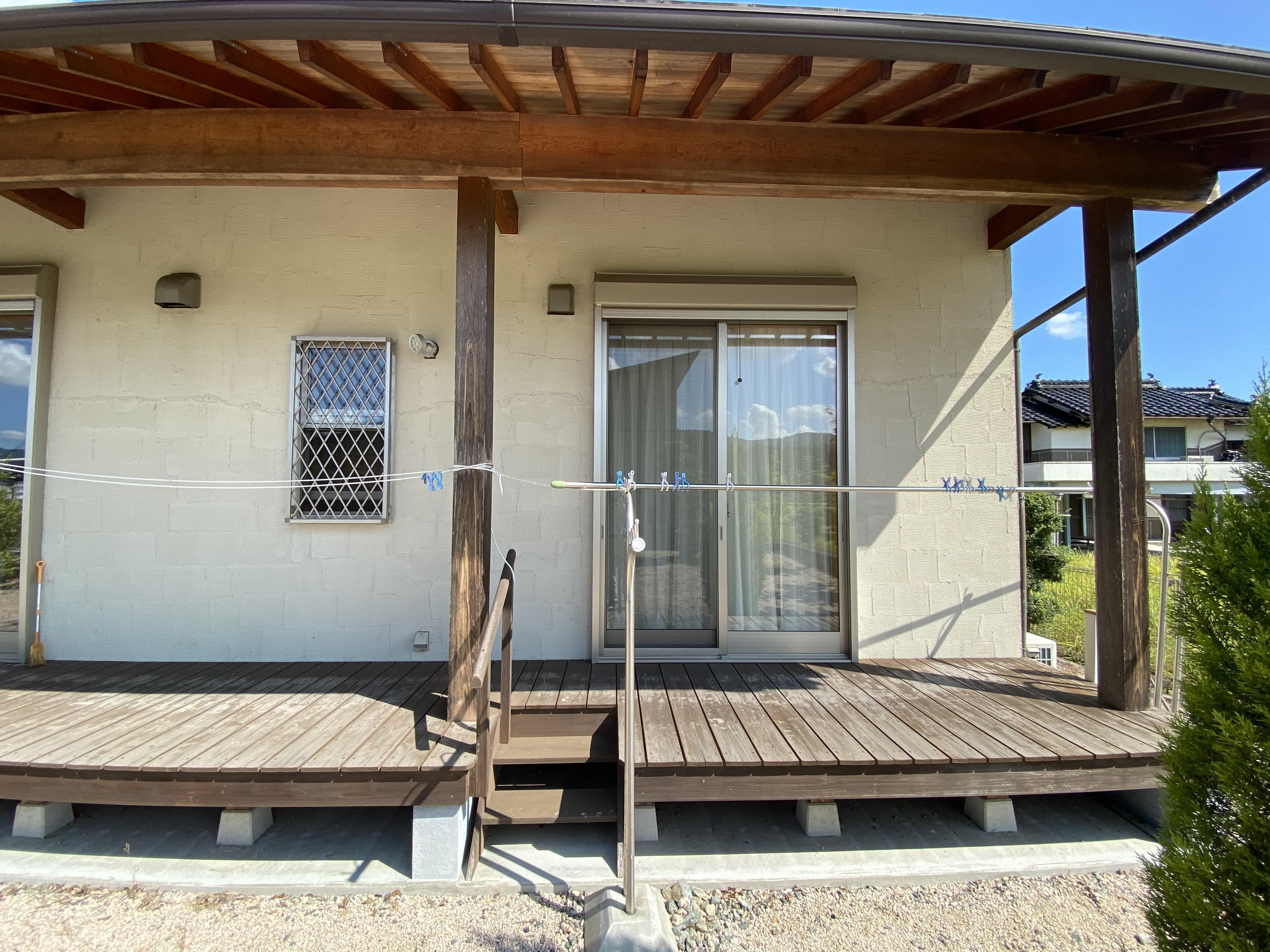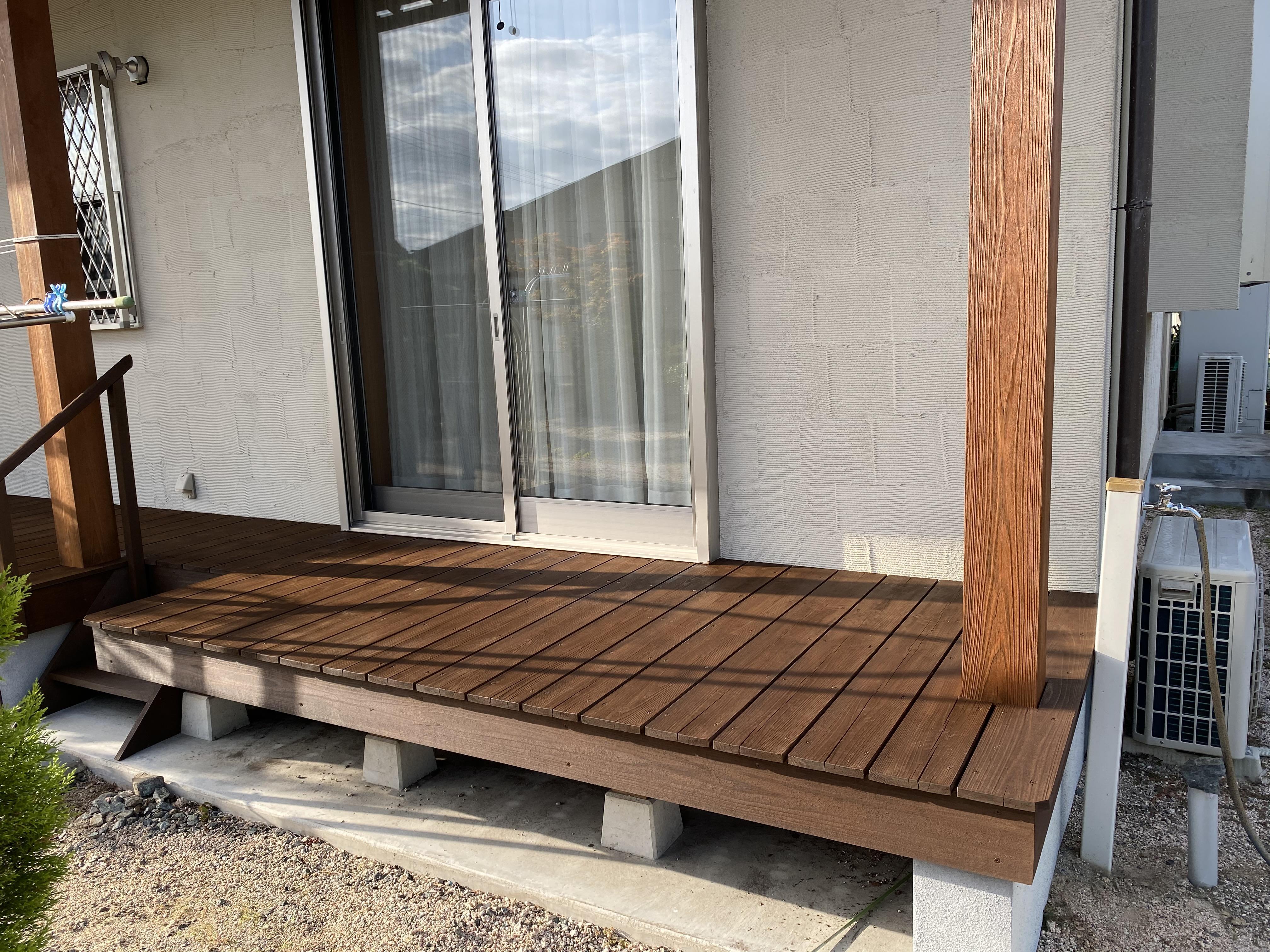 今回は塗り替え塗装で対応でき、ウッドデッキや柱をきれいにすることができました。 施主様には今後の対応として、通常のメンテナス方法を伝えたり、ウッドデッキの塗替時期が 5年前後が目安で、劣化症状がでてきたら早めに相談されることを提案しました。