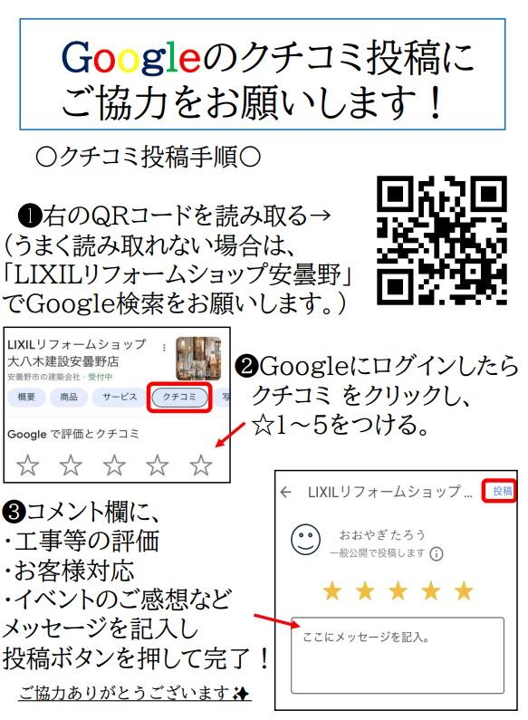 当店でリフォーム工事をさせていただいたお客様や、イベントなどで足を運んでくださった方々、是非口コミ投稿をお願いできないでしょうか?
