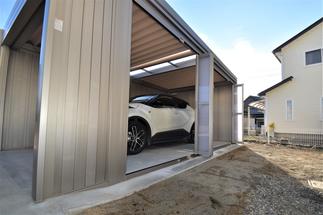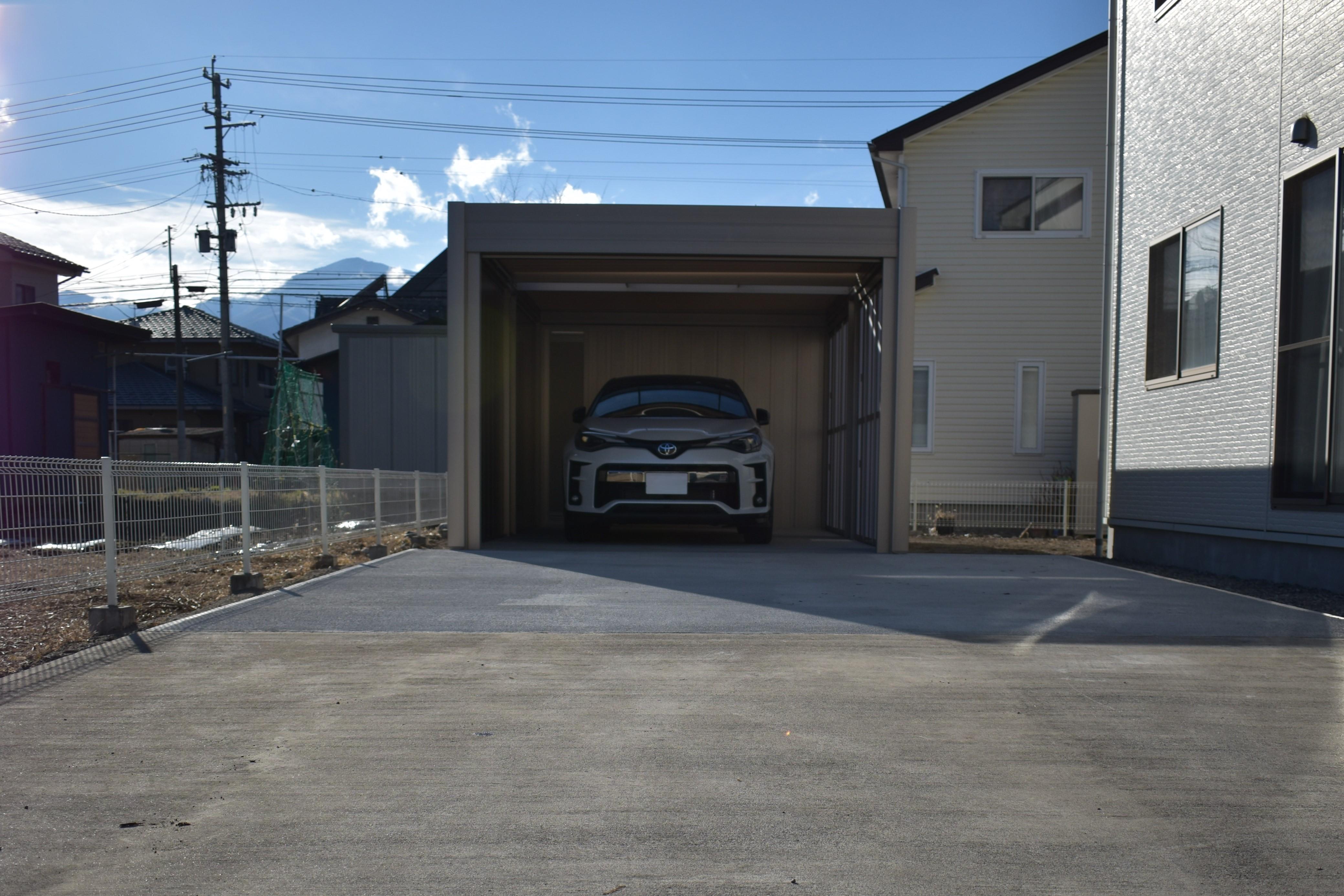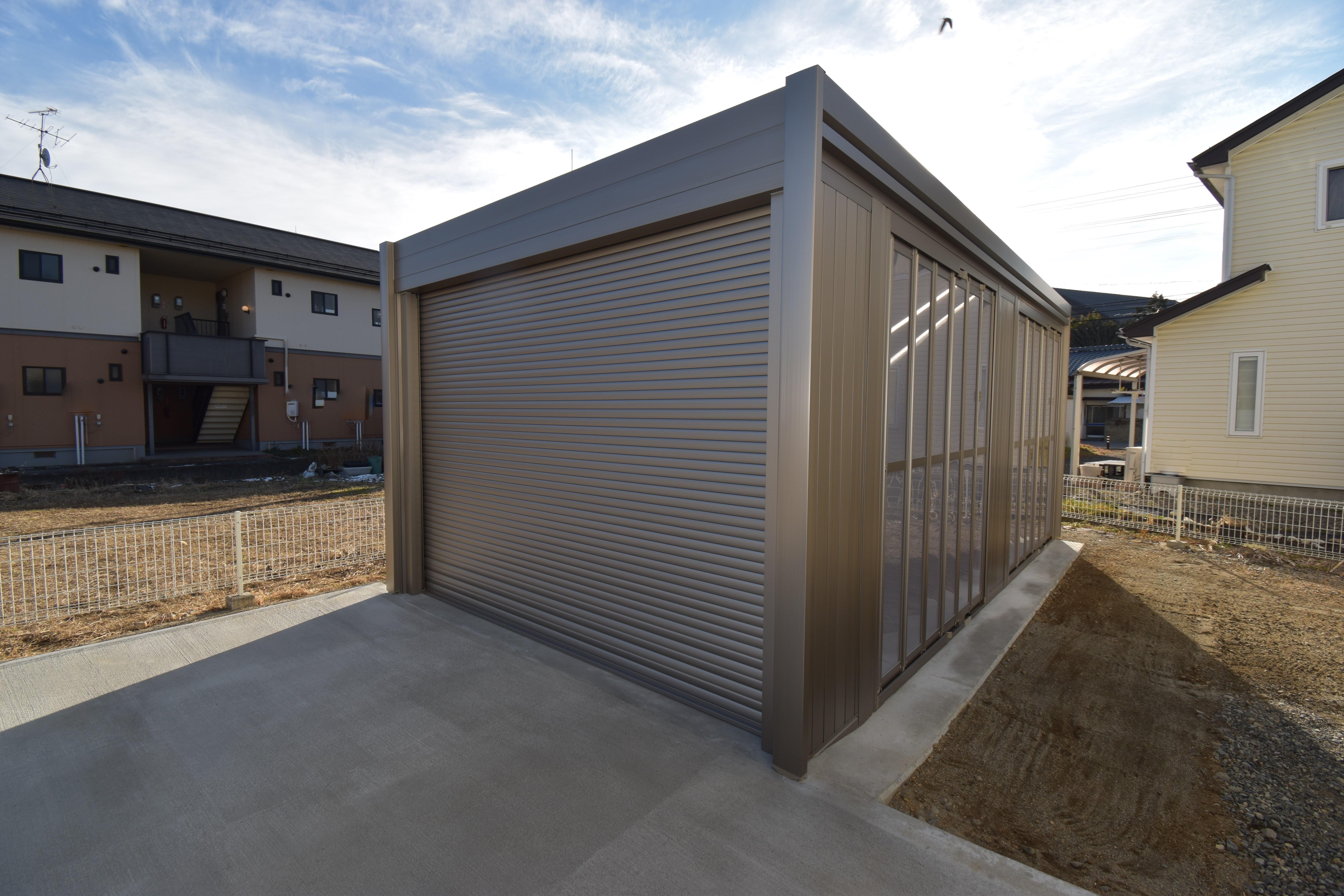 住宅や店舗の立ち並ぶ道沿いにあり、強い風が通り抜ける自宅の庭スペースに、ご自身の愛車の為にガレージを新設されました。