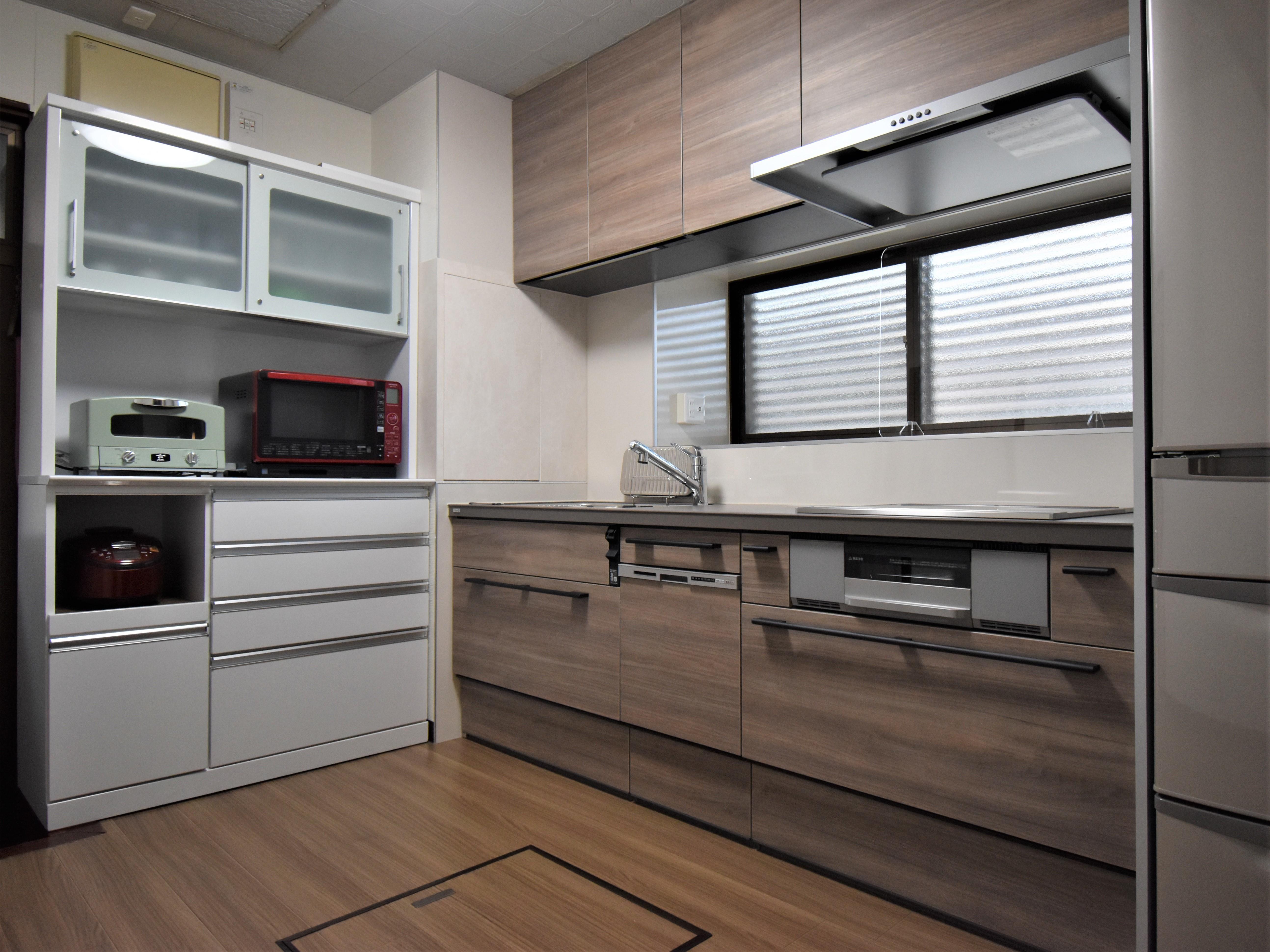 冷蔵庫と加熱機器の間には「不燃エンドパネル」を設置しました。元々あった出窓には「キッチンパネル」を張りましたので、家電製品をおく場所に使用できます。目線で使いやすい高さの為、配膳台の様に使用しても良いですし、観葉植物等を育てても良いかも。