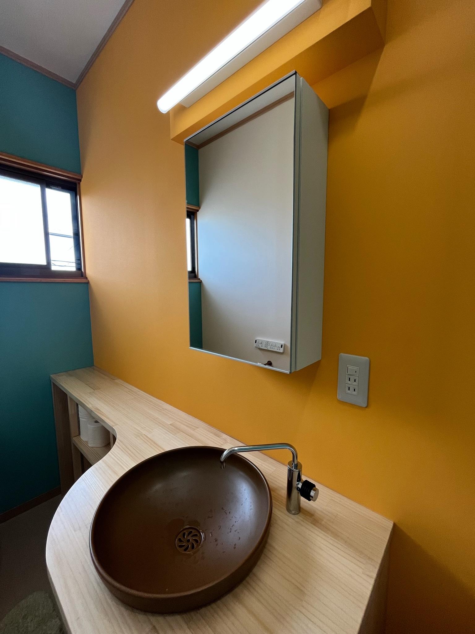 元々手洗い器はタンクについていましたが今回カウンターを造作し、波公房釉シリーズのオーバーカウンター式手洗い器を設置しました。