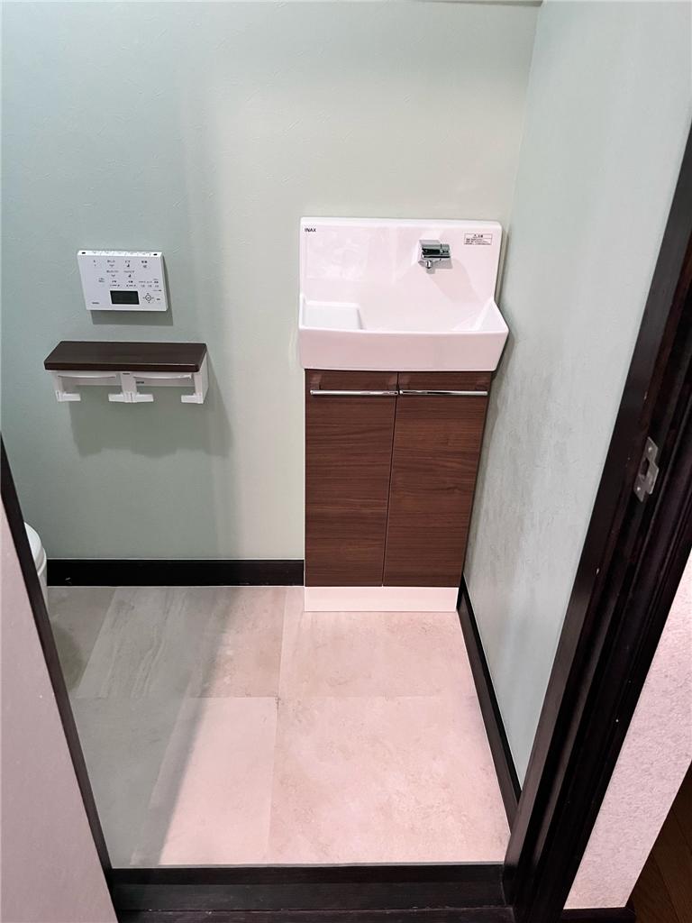 O様邸のトイレは約0.9m×1.8mとスペースが限られていますが、「コフレル」シリーズなら、トイレットペーパーや掃除道具を収納するスペースを確保しながら、スッキリ設置することができます。