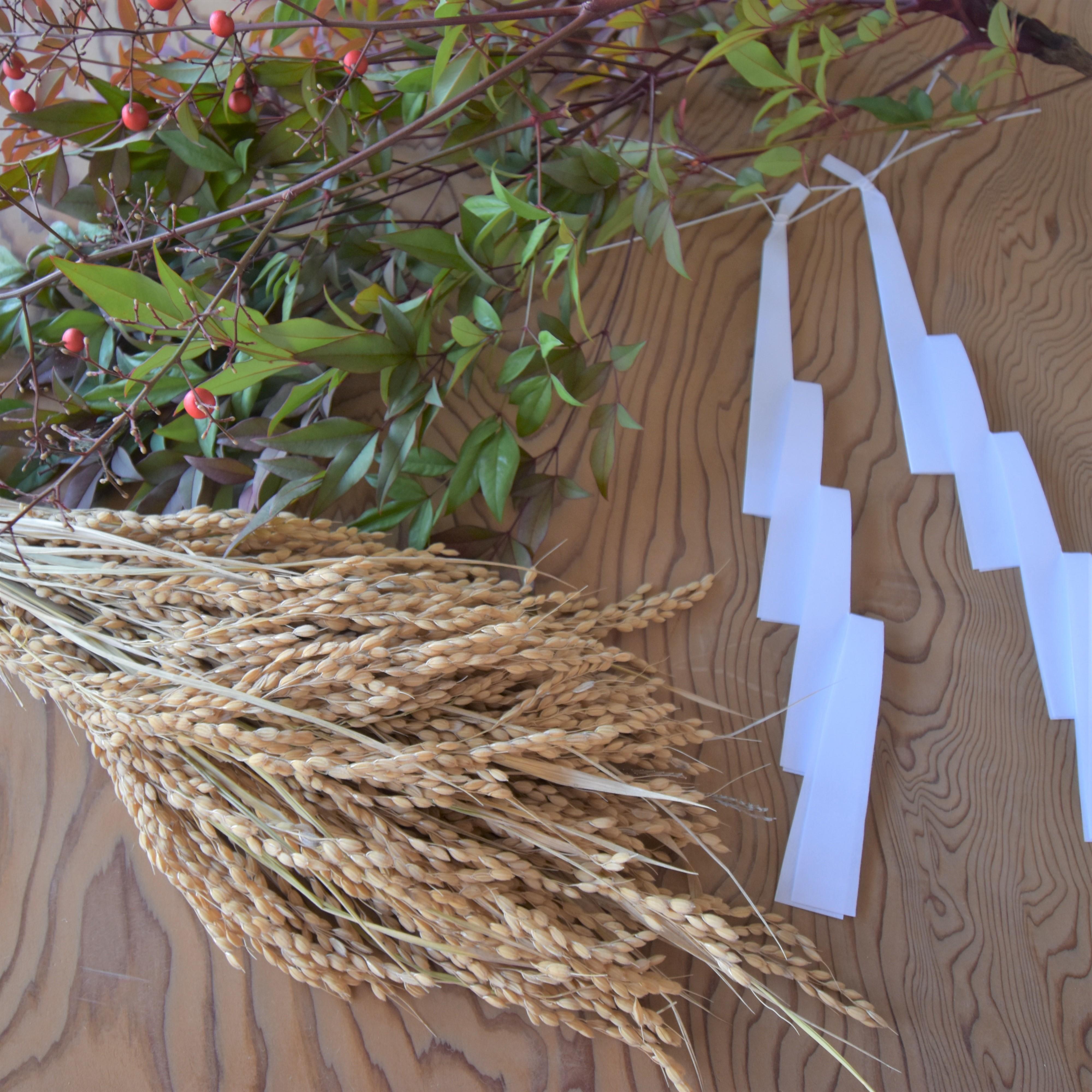 こちらで 赤い実、南天の葉、水引(若干)、紙垂(しで)をご用意しています。