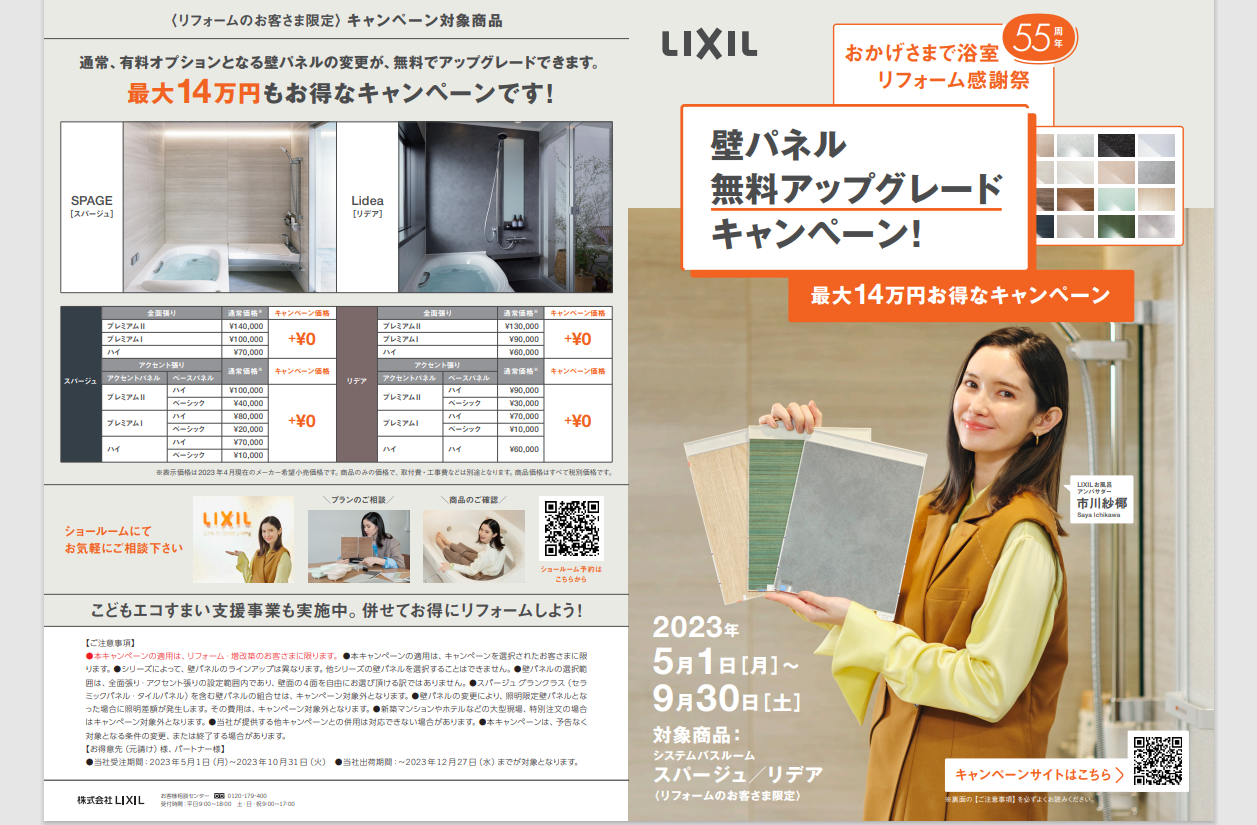 ユニットバス販売開始から55年の感謝を込めて、、壁パネル無料アップグレードキャンペーンが実施されています!