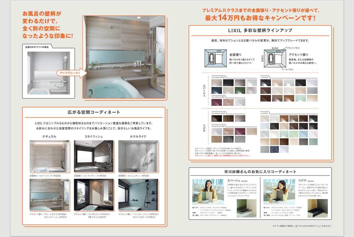 通常、有料オプションとなる浴室の壁パネルの変更が、無料でアップグレードでき、最大14万円お得になります!