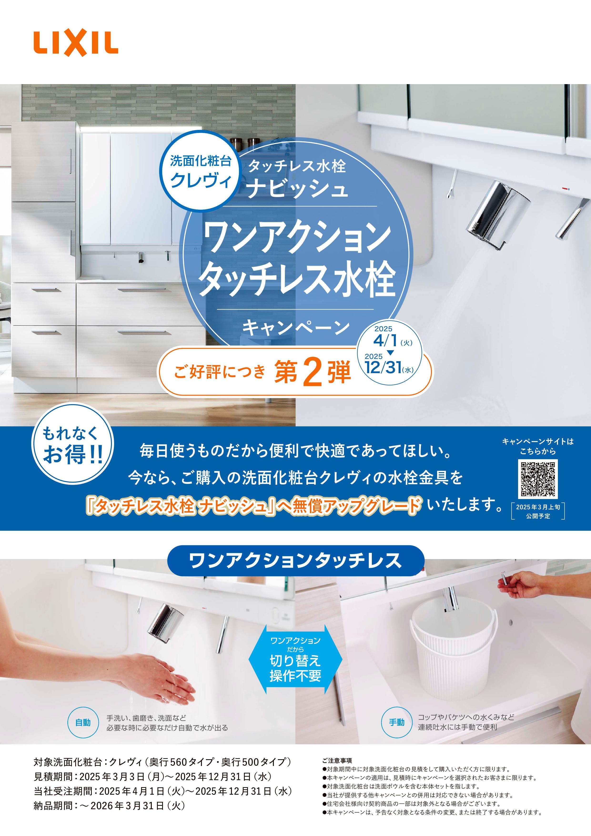この「クレヴィ」を対象期間中に購入いただくと、タッチレス水栓に無償アップグレードさせていただくキャンペーン。