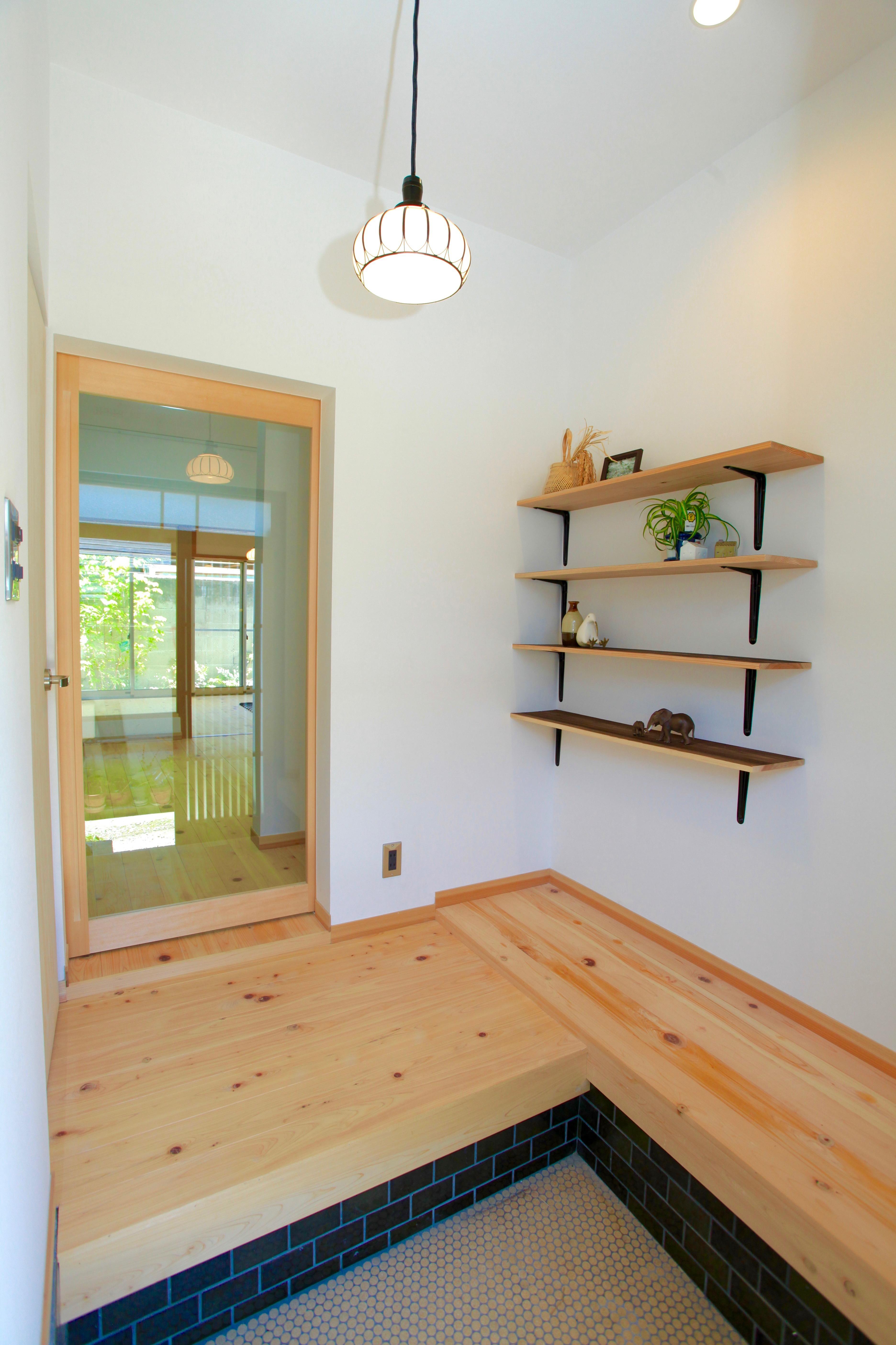 床は桧の無垢フローリングを使用。壁は調湿効果のある紙クロスで上から漆喰を塗ることもできます!庭からの緑が玄関から見えるようにガラスの扉を採用。