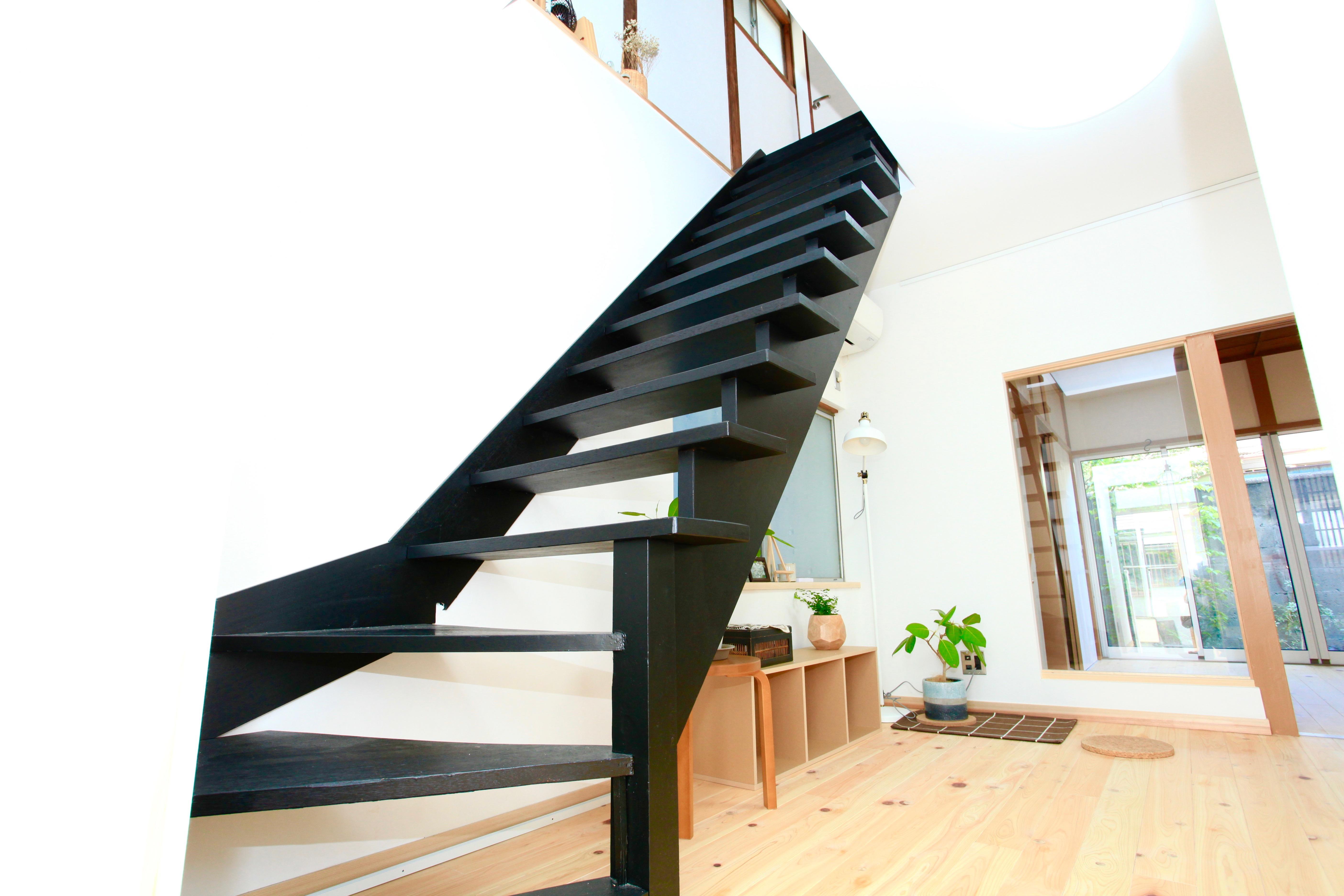 リフォーム前は銀色のパイプの手すり付いていましたが取り外して階段も黒く塗り印象の残る階段に。