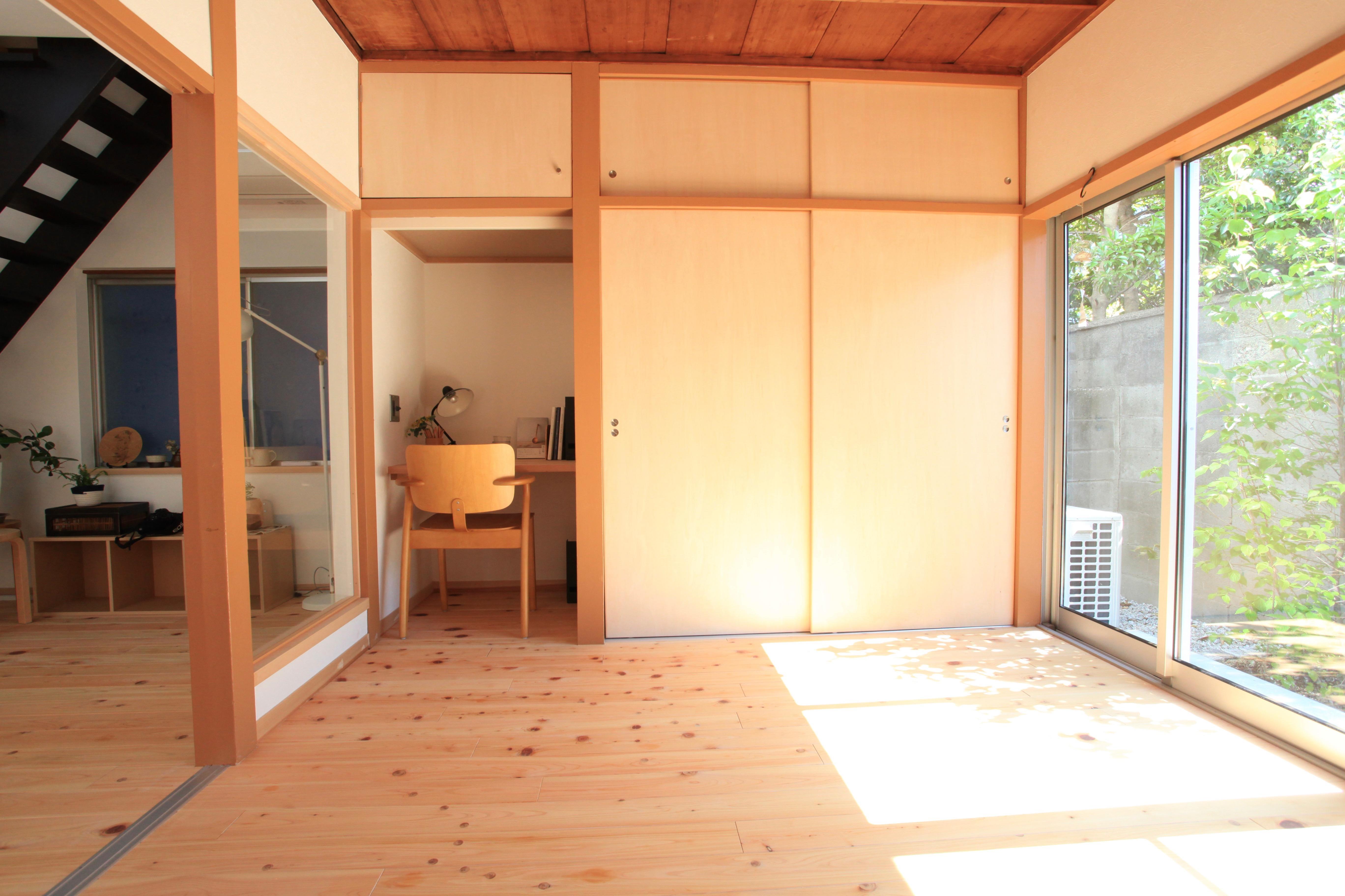 床は桧の無垢フローリングを使用。一面押入れのものを作業スペースとクローゼットに。建具はシナ合板でシンプルな雰囲気に♪