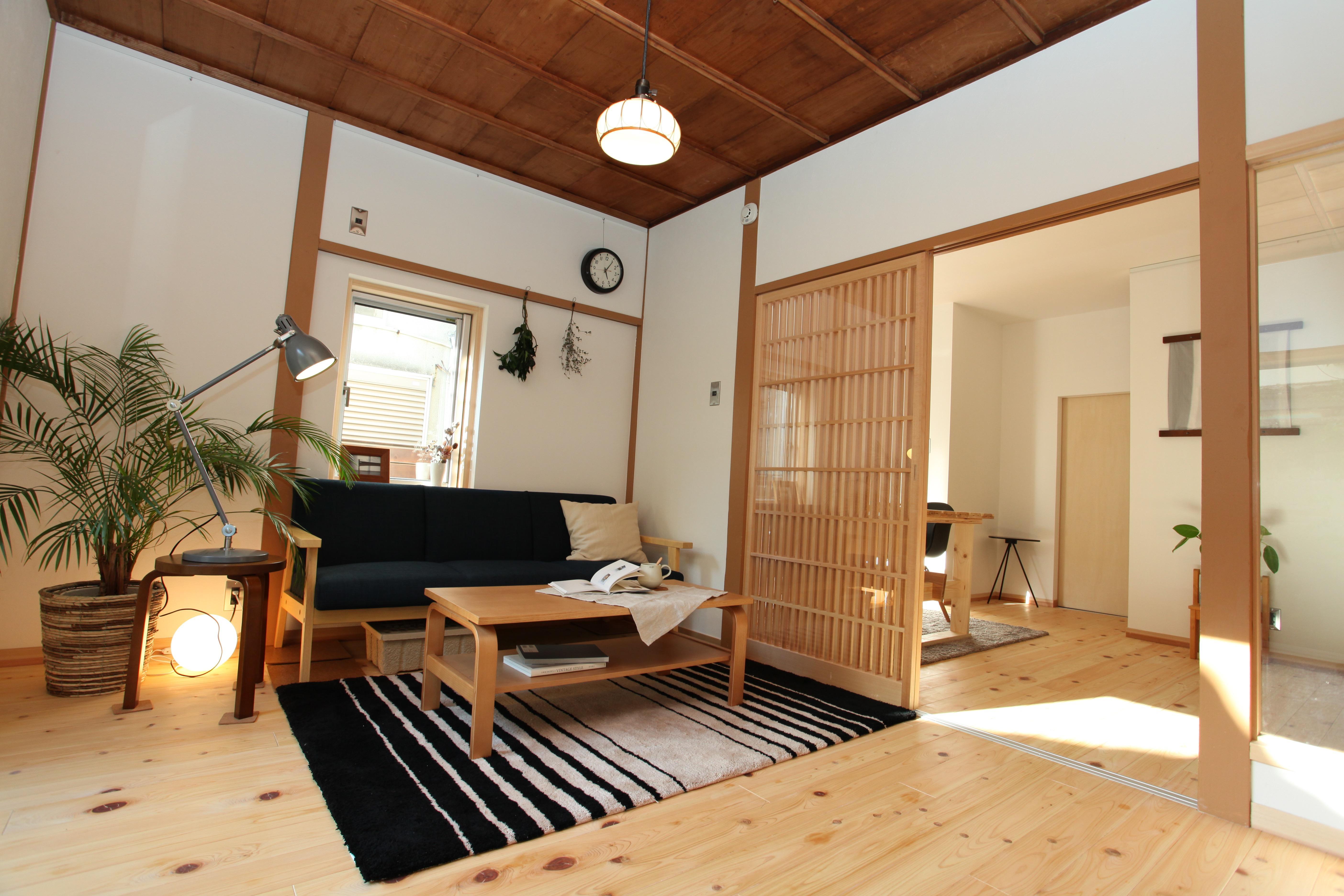 桧の無垢フローリングを使用。元の和室の竿縁天井を残し古民家風な洋間に♪