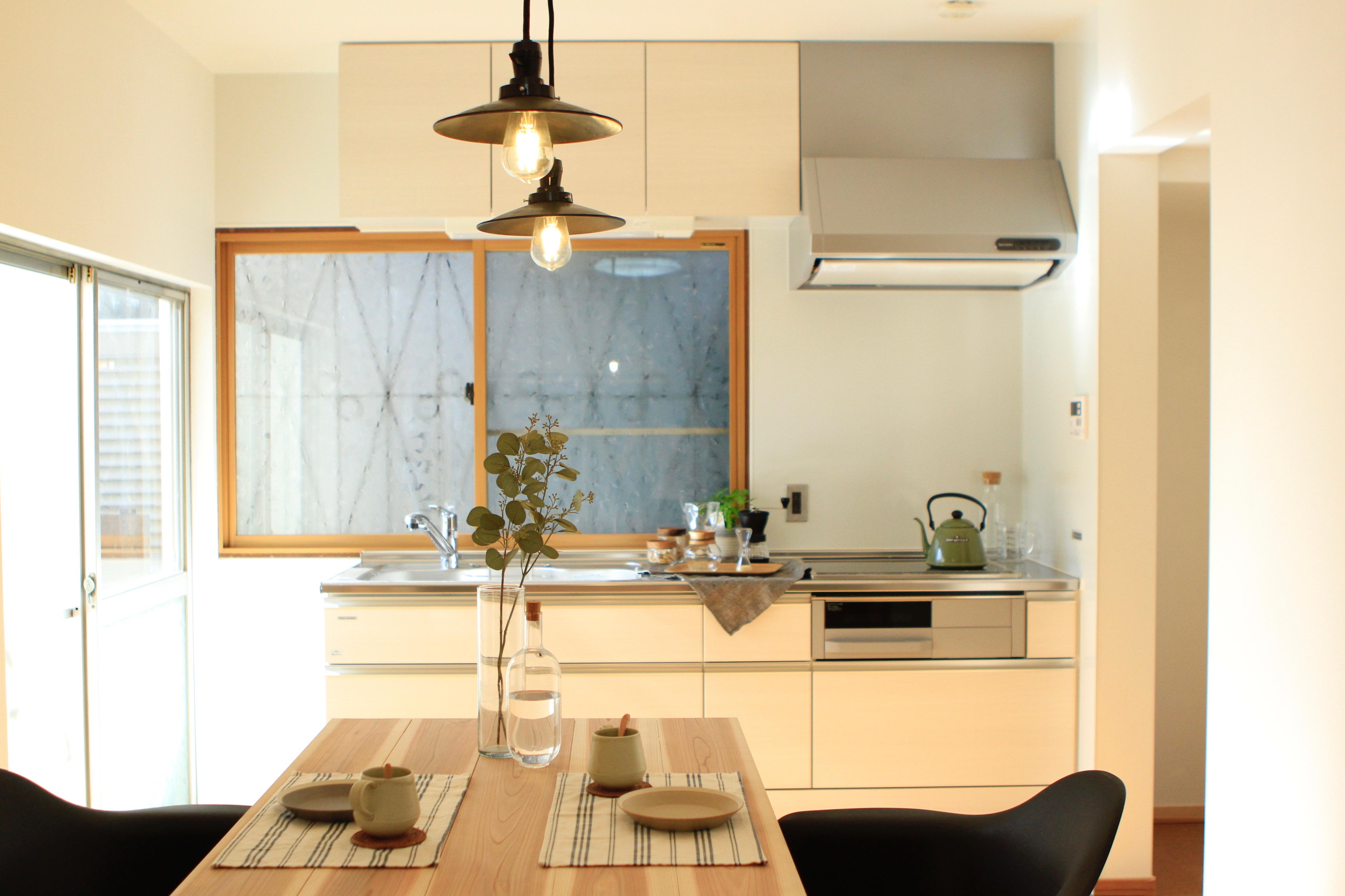 リフォーム前は居室で奥の窓のインプラスもそのまま利用。キッチンは幅2100m。右側はパントリー兼脱衣室、浴室で動線を考えて設計されています。