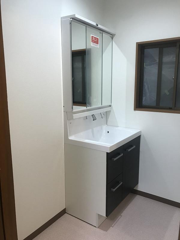 洗面化粧台を新しくし、クロス、クッションフロアも張替えました。
