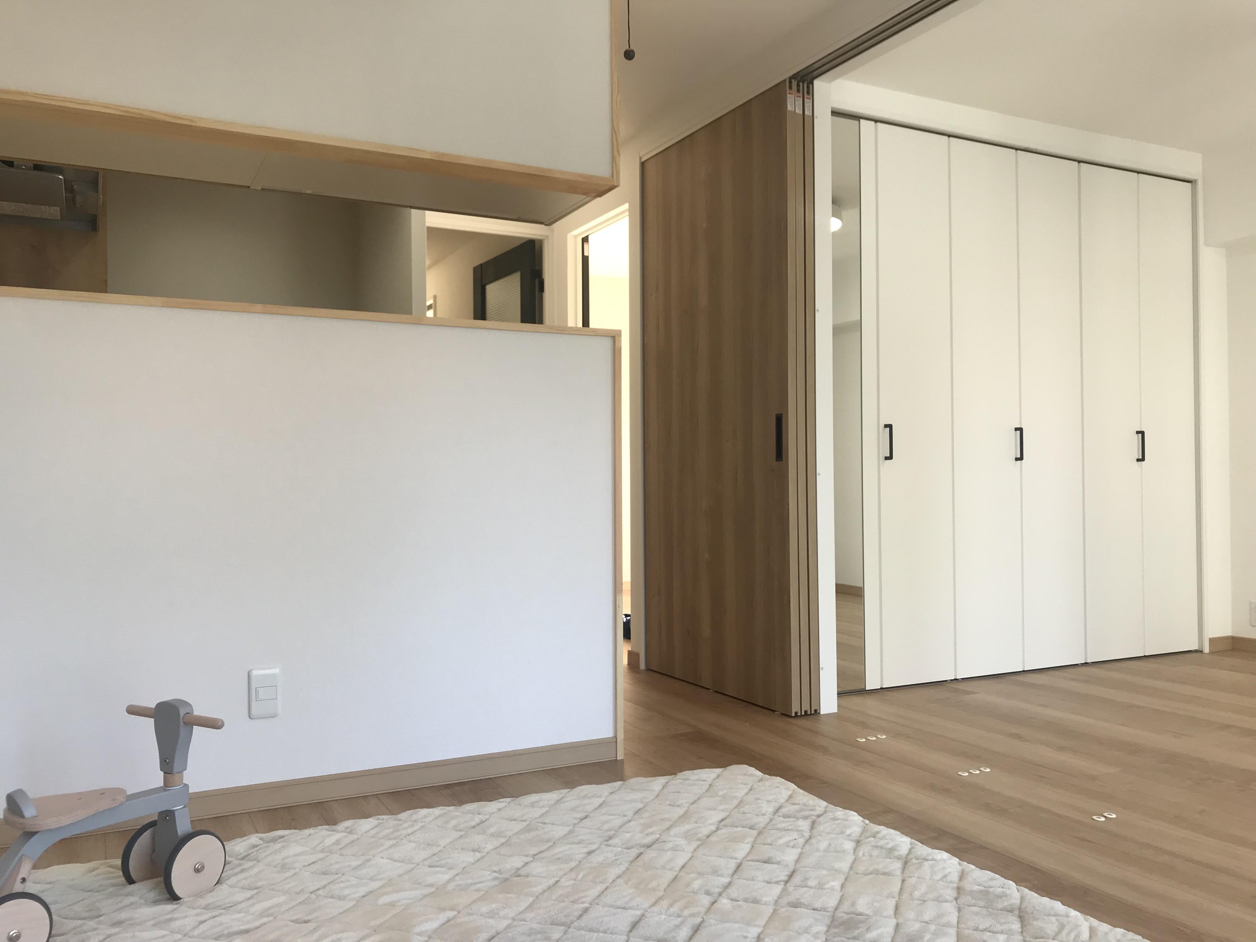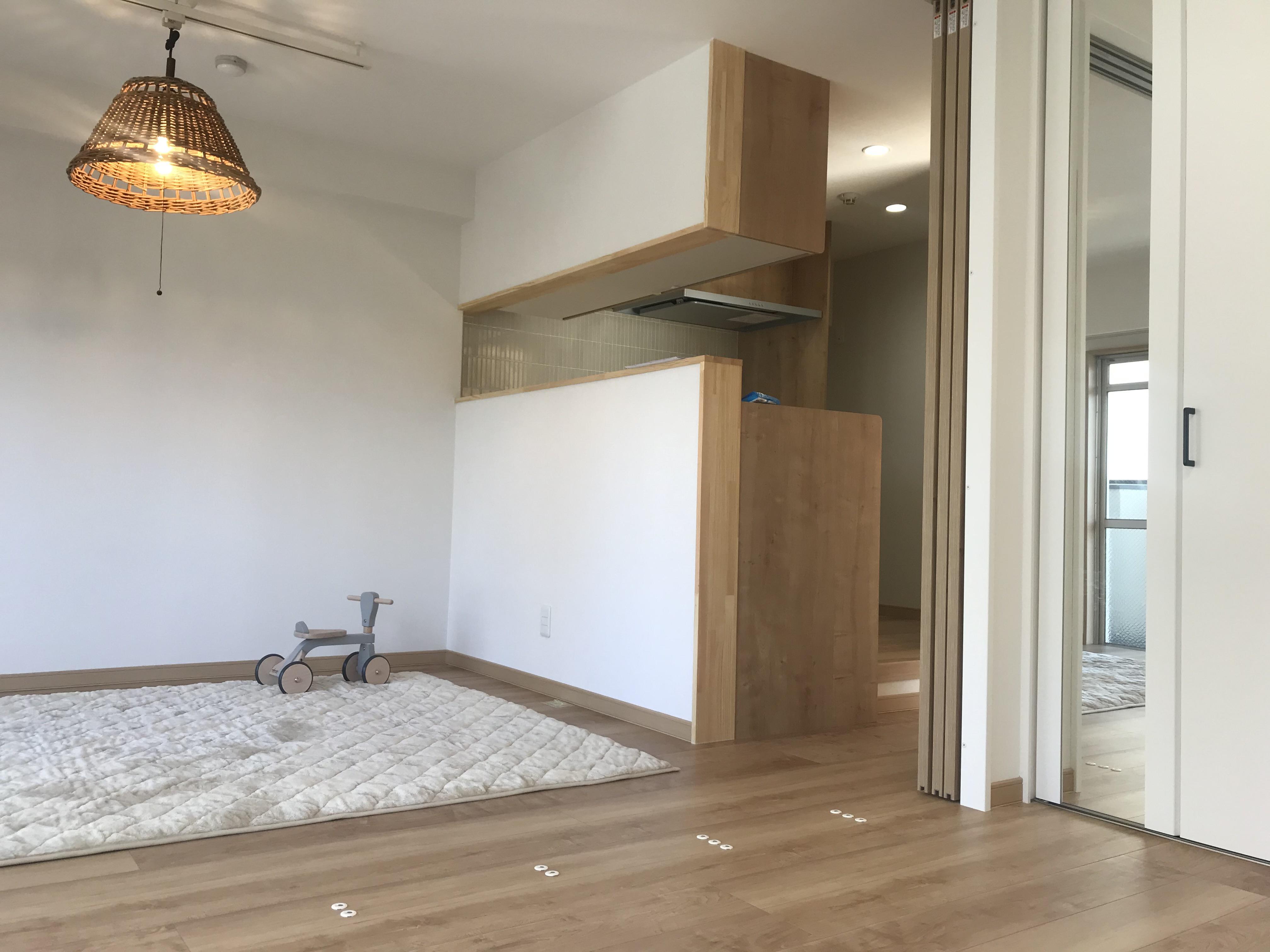 中古マンションを購入し、リフォームのご依頼を頂きました。 とても仲の良いお洒落なご夫婦で、1才のお子様がいる三人家族 お子様のために部屋を増やし、水回りも全て入れ替え、 1LDKから2LDKへフルリノベーション致しました。 1つ1つお客様のこだわりをヒアリングしながら、 お打ち合わせさせていただき、素敵な空間を作ることが出来ました。 リビングが狭くなってしまう理由から奥様が最後まで悩まれていたL型キッチンも採用されとても喜んでくださいました。 内覧の際は、ご夫婦そろって喜んでいただき、 弊社スタッフも満足でき、 とても勉強になり楽しみながら施工できました。ありがとうございました!