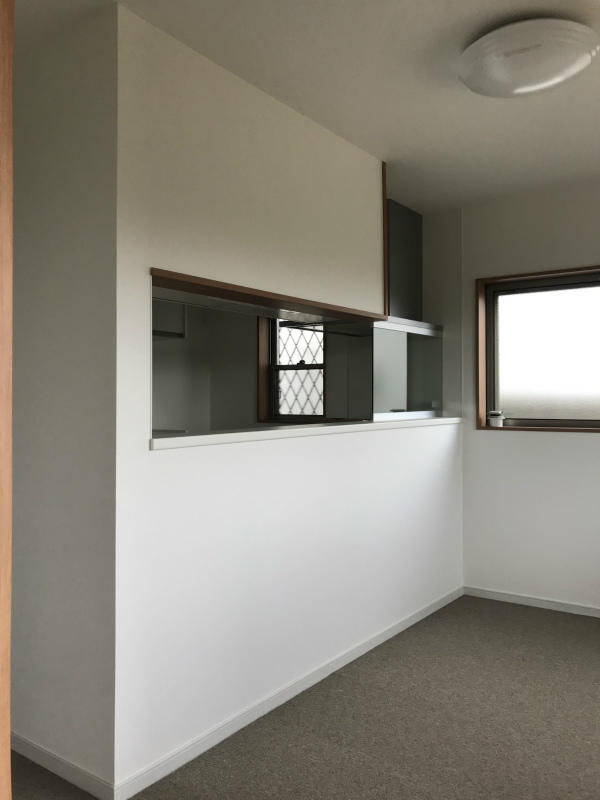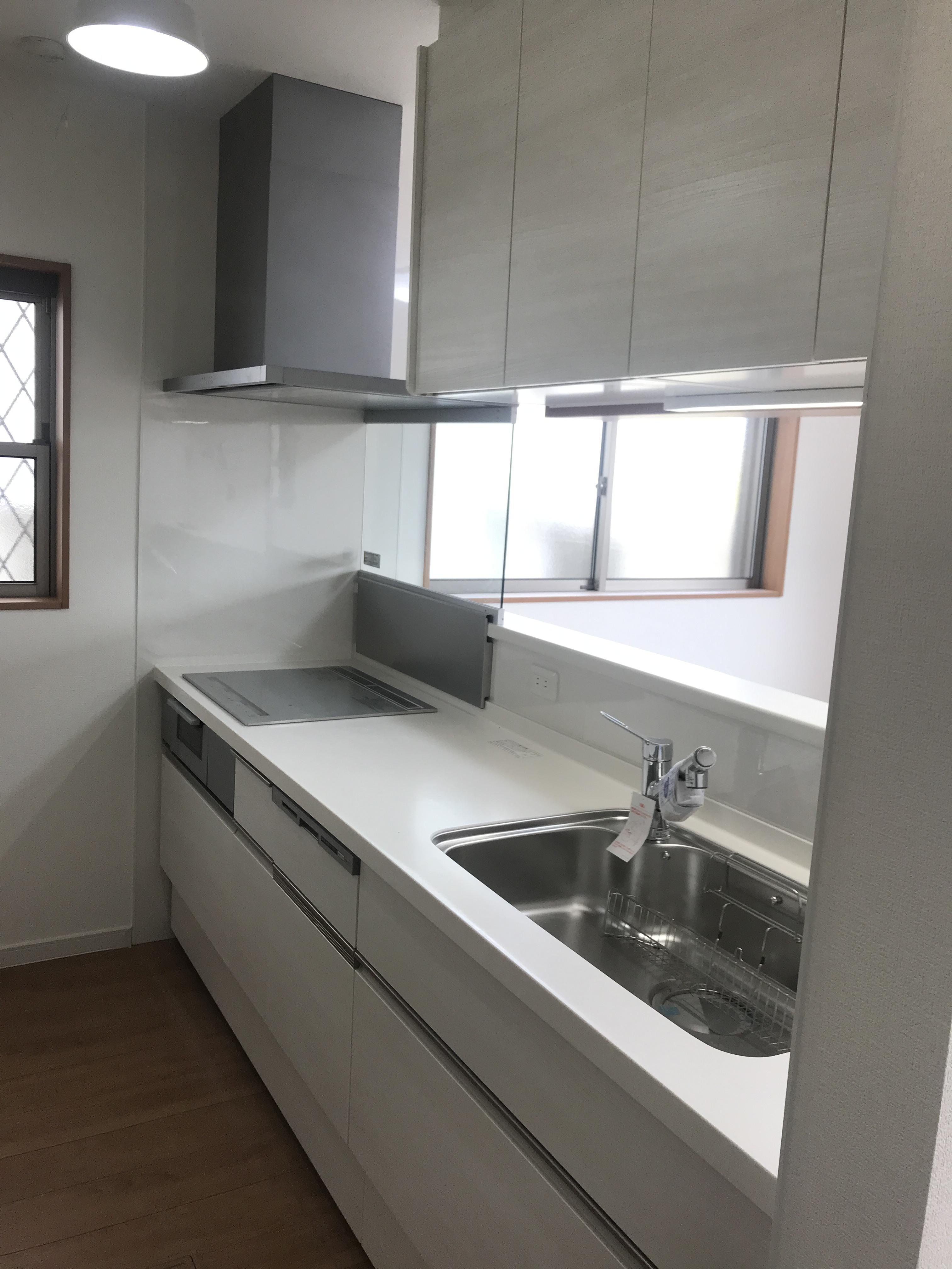 壁付けキッチンから対面キッチンにしました。お客様のご希望でガラスパネル設置いたしました。