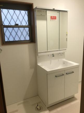 洗面化粧台は、LIXIL MVの扉はグロスホワイト。床は、クッションフロアで明るい雰囲気に変わりました。