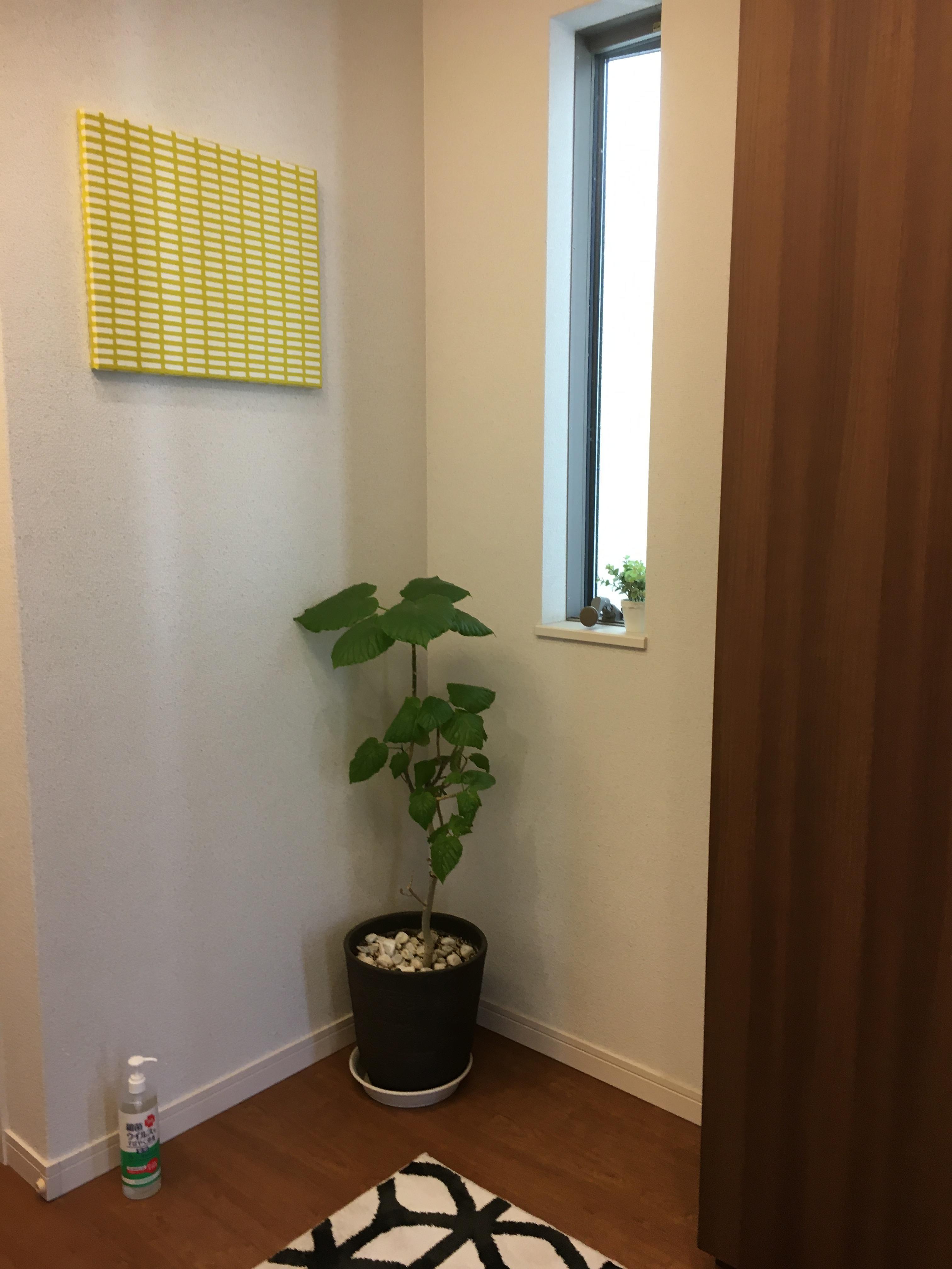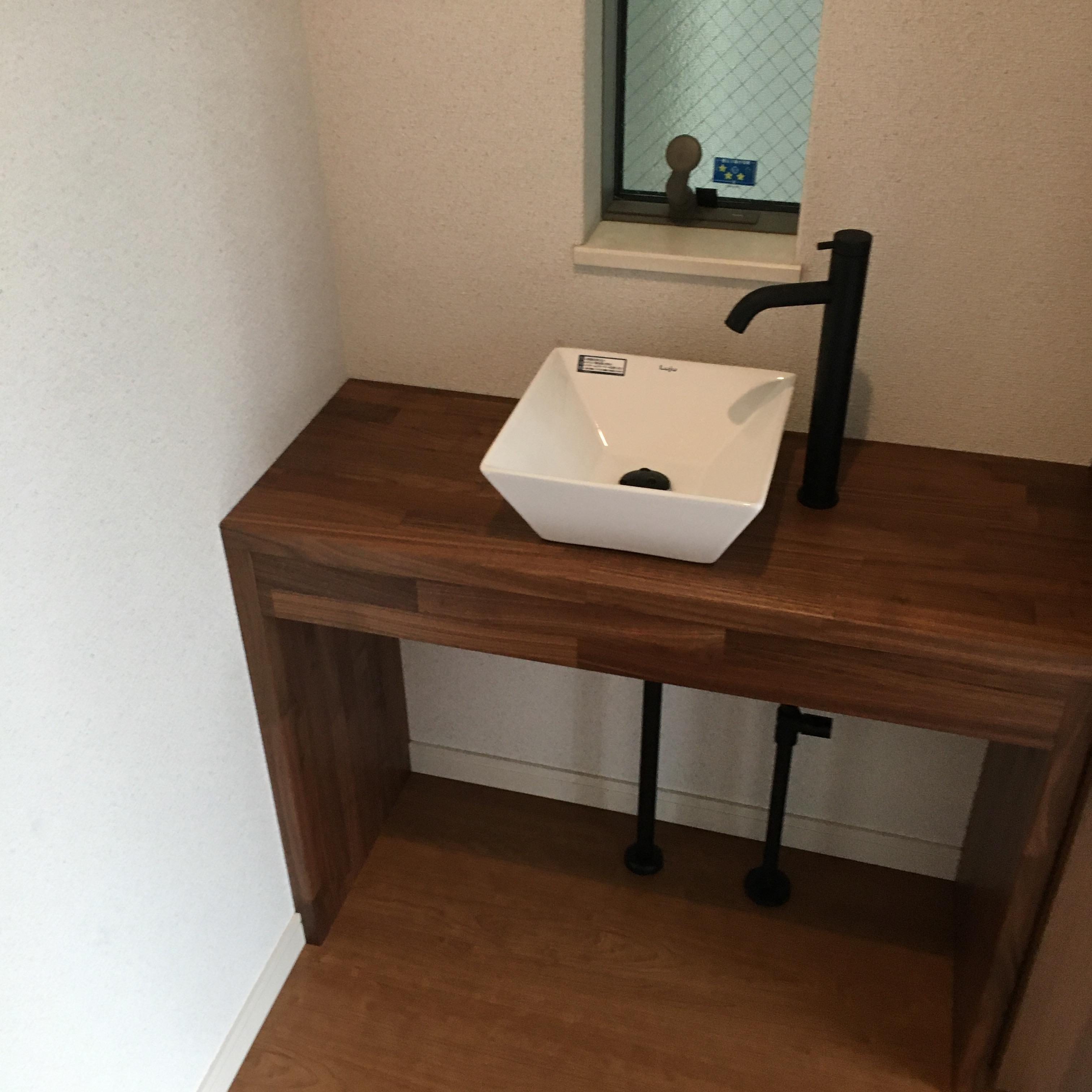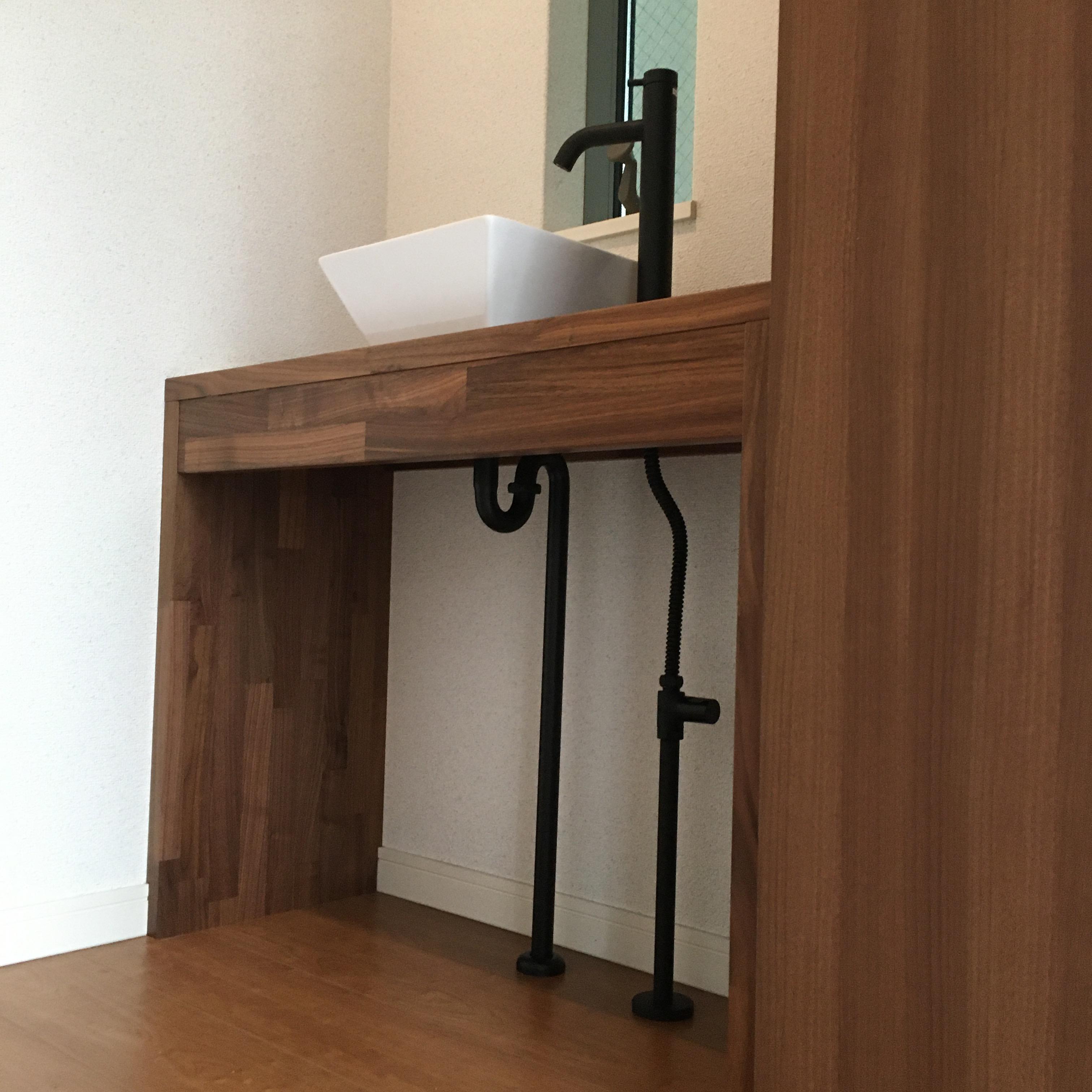 ご帰宅後、すぐに手を洗えるよう玄関に洗面台を設置いたしました。 ウォルナット、洗面ボウル、水栓など全てお客様にお選びいただきとても素敵な洗面台が完成いたしました。