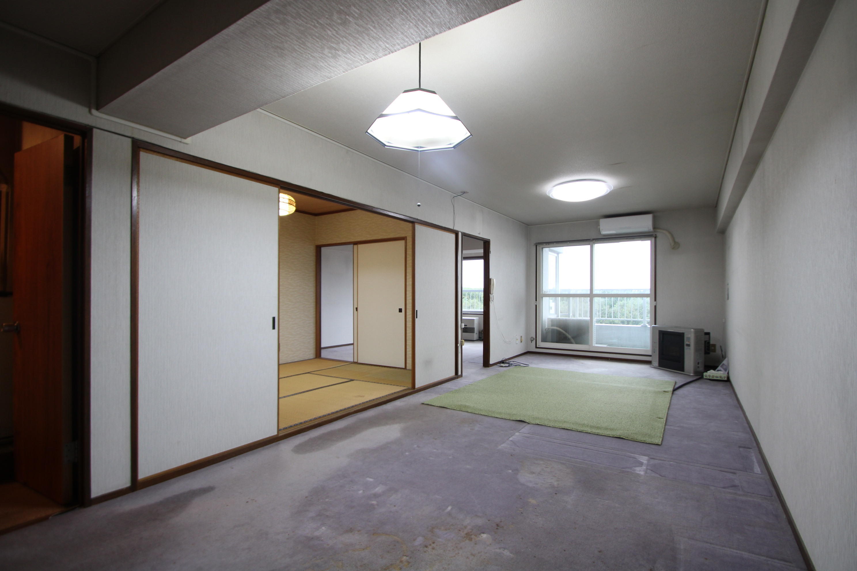築38年くらいのマンションでカーペットと和室の造りの一般的なマンションで眺望はいいのに、壁が多く暗いイメージでしたが、フローリングを張替し、不要な壁を取り払い生活しやすいく、明るく開放的な住宅になりました。