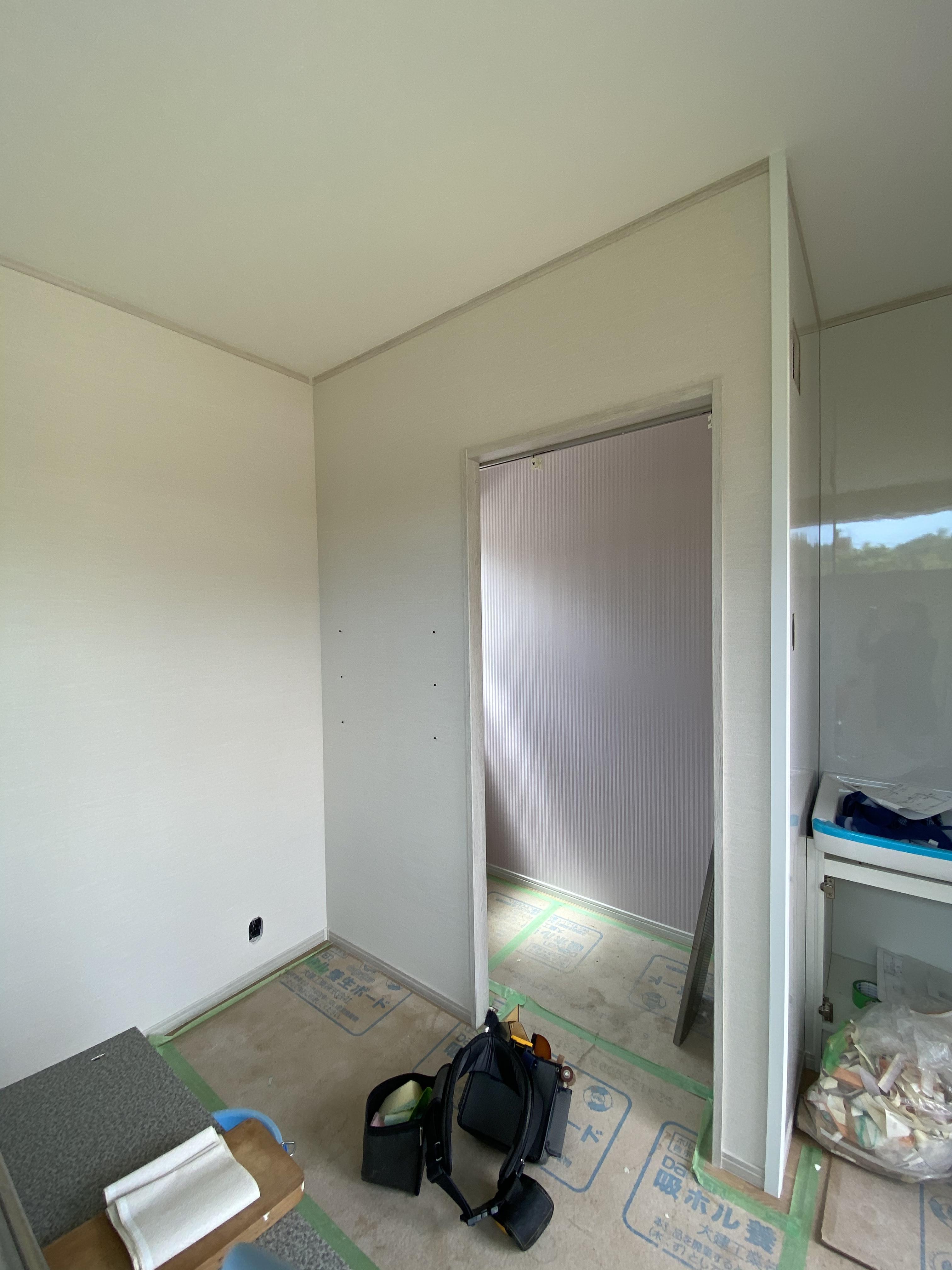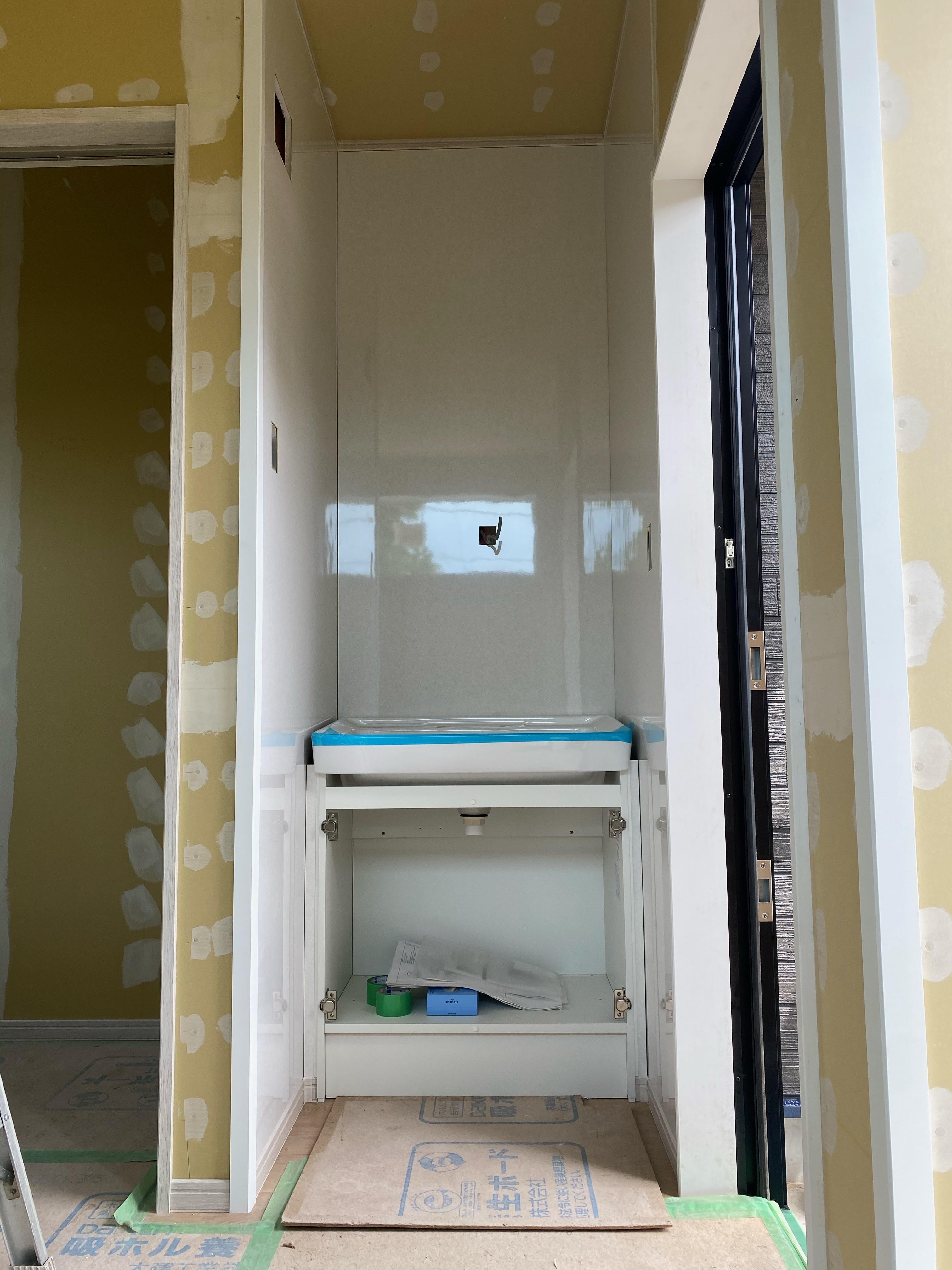 ☟洗面部分にはキッチンパネルを貼り、もう少しで完成です。
