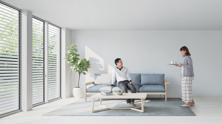 外付けブラインドがあることで、室内にカーテンがいらなくなり、窓まわりがスッキリします。