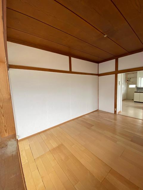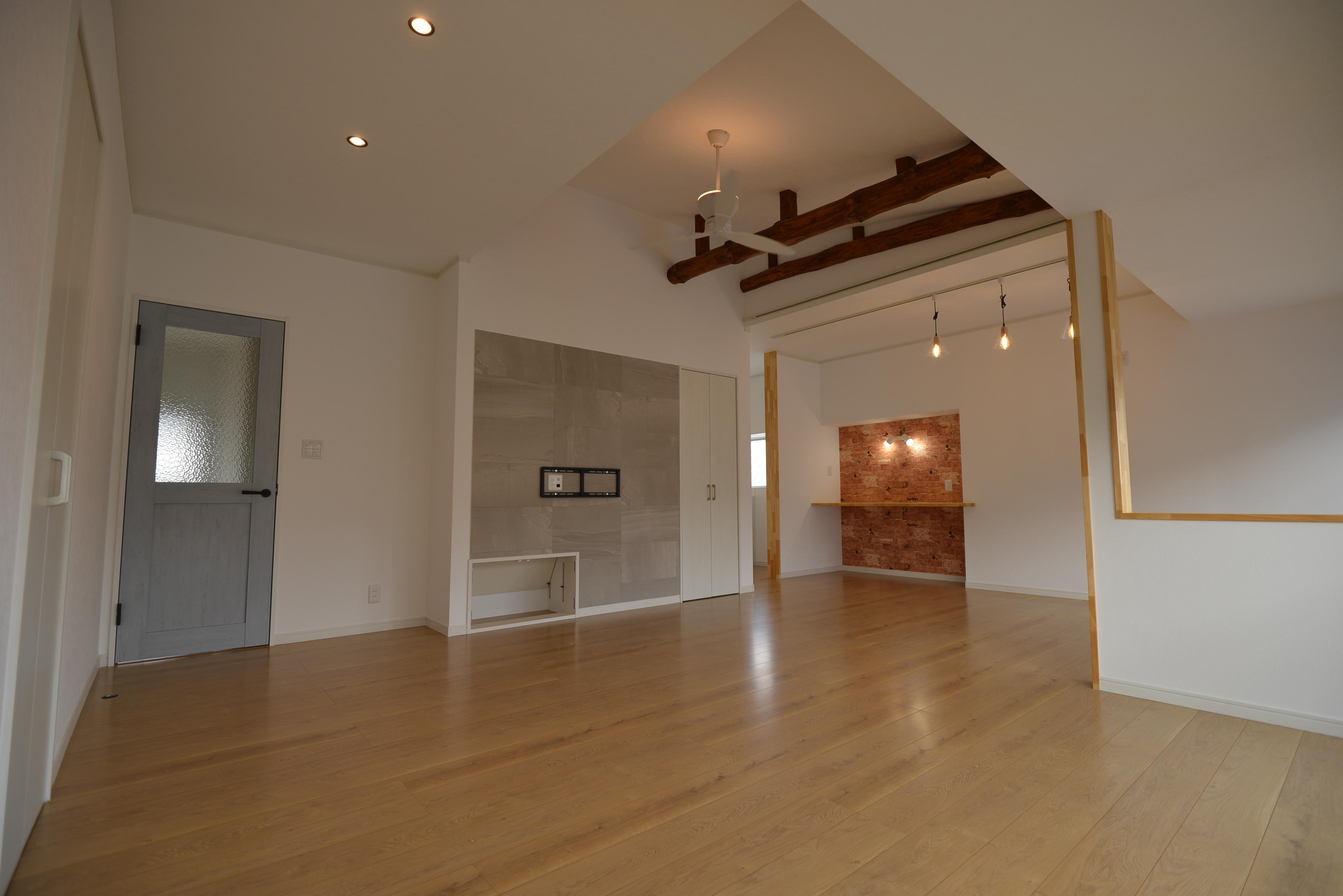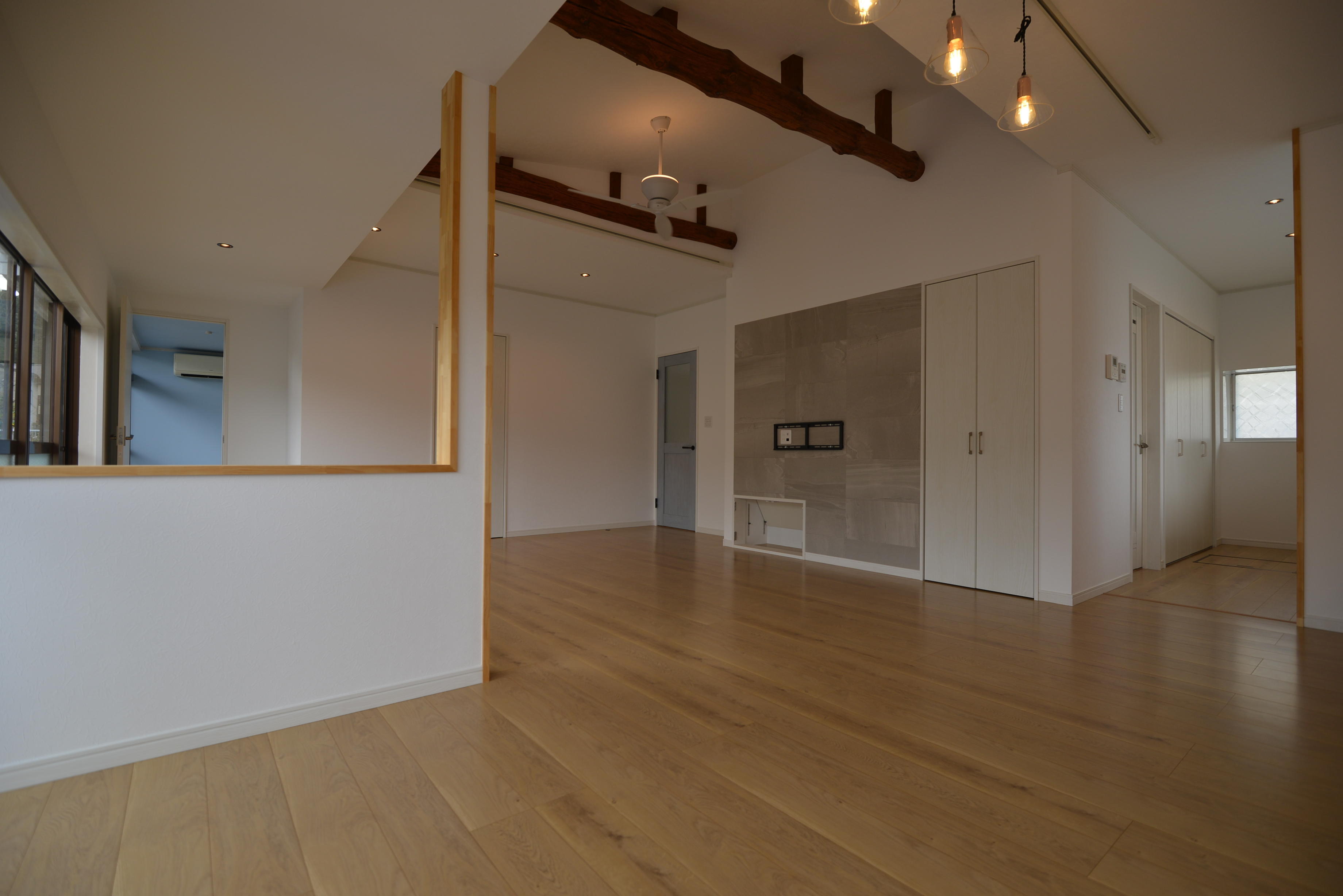 隣の部屋との境目の壁と天井を壊し、広いリビングルームにリノベーションしました。 解体中にいい梁が出てきたので、それを利用しています。 高い天井と広い空間、白い壁紙がとても清潔感のあるスペースになっています。 アクセントに、エコカラットを貼りました。