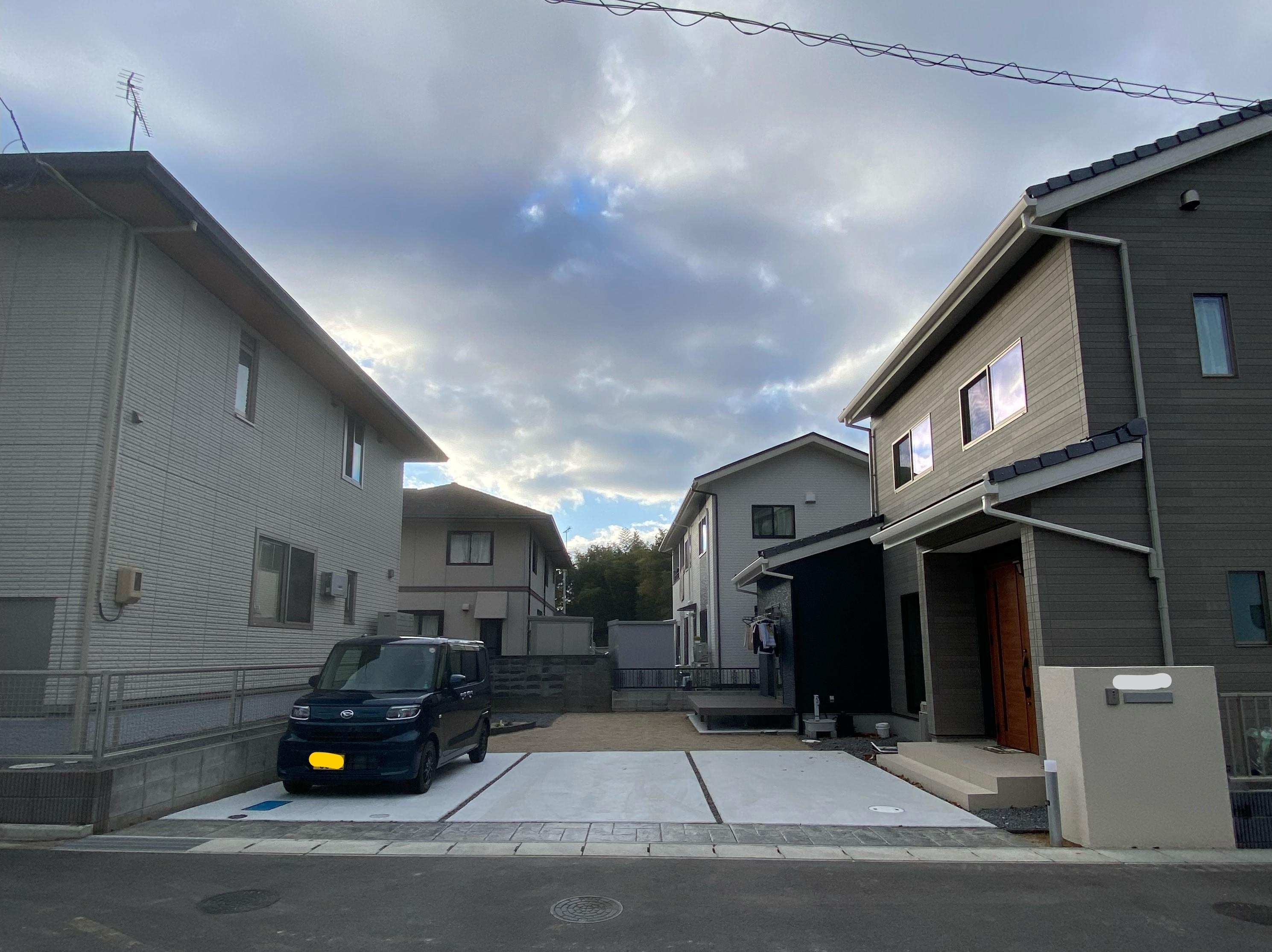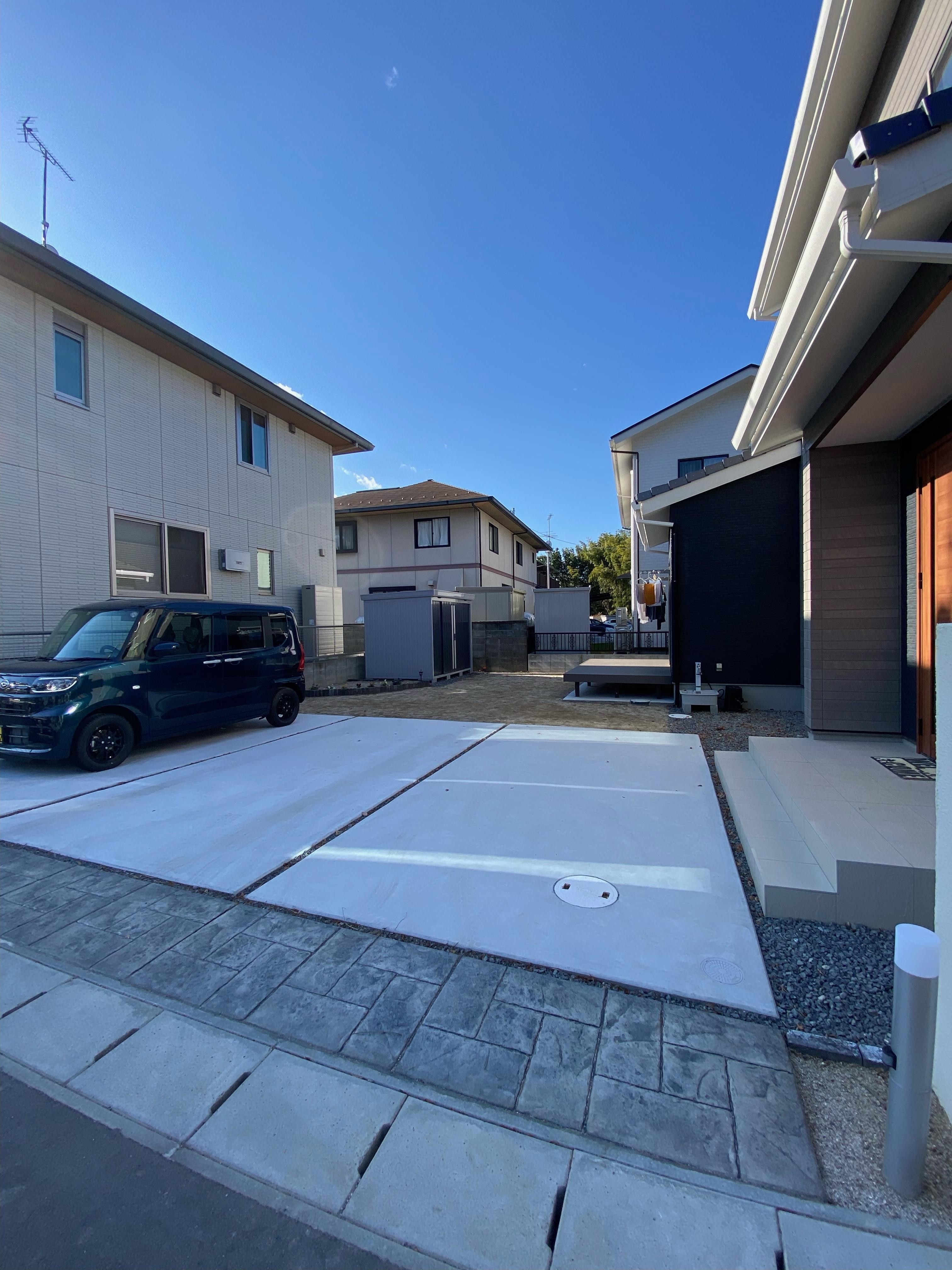 LIXILの樹ら楽ステージを設置しました。 車を停める場所はコンクリート施工です。 人気のスタンプコンクリートをポイントに使っています。 便利な宅配ボックスの設置もしました。