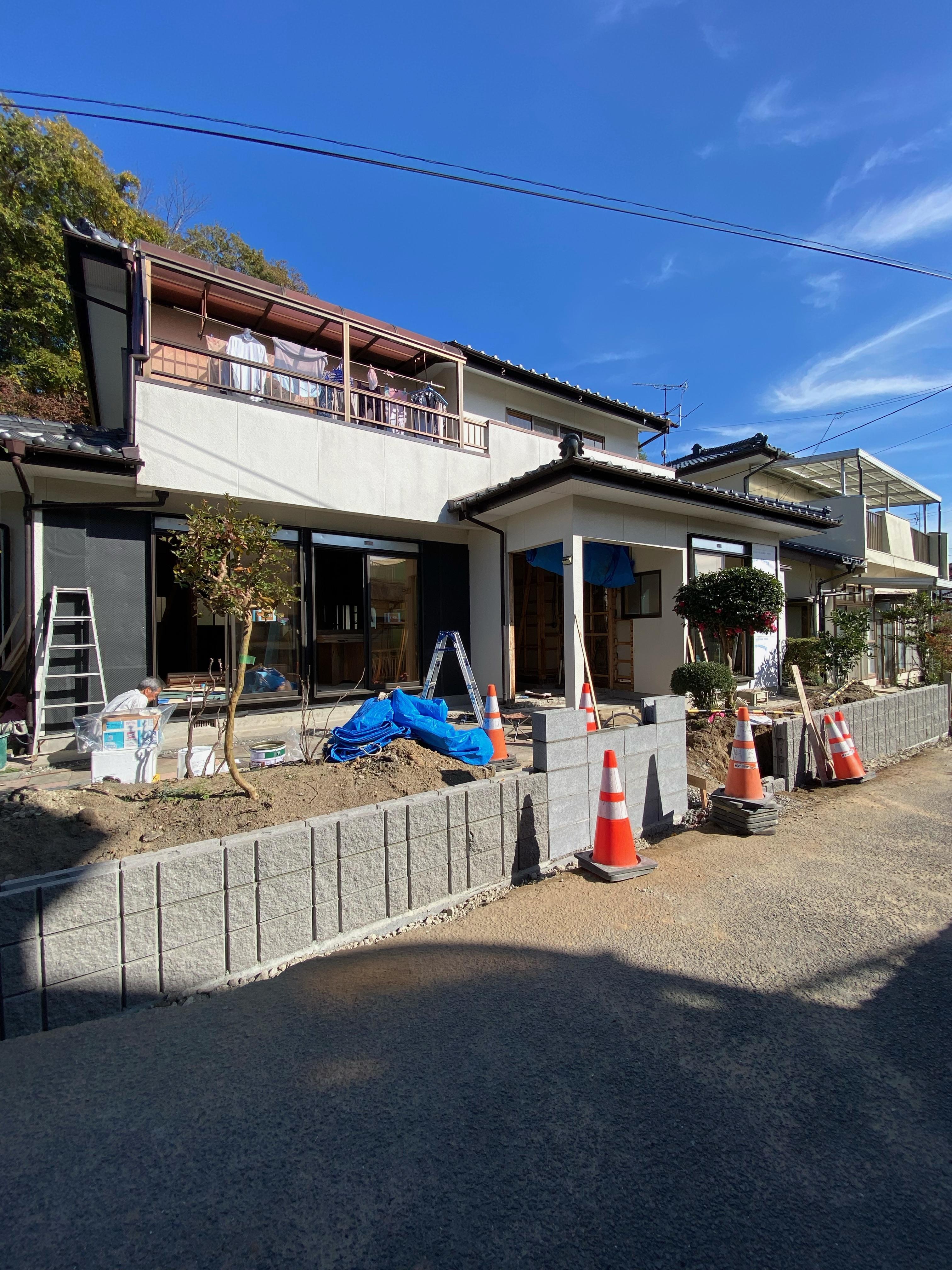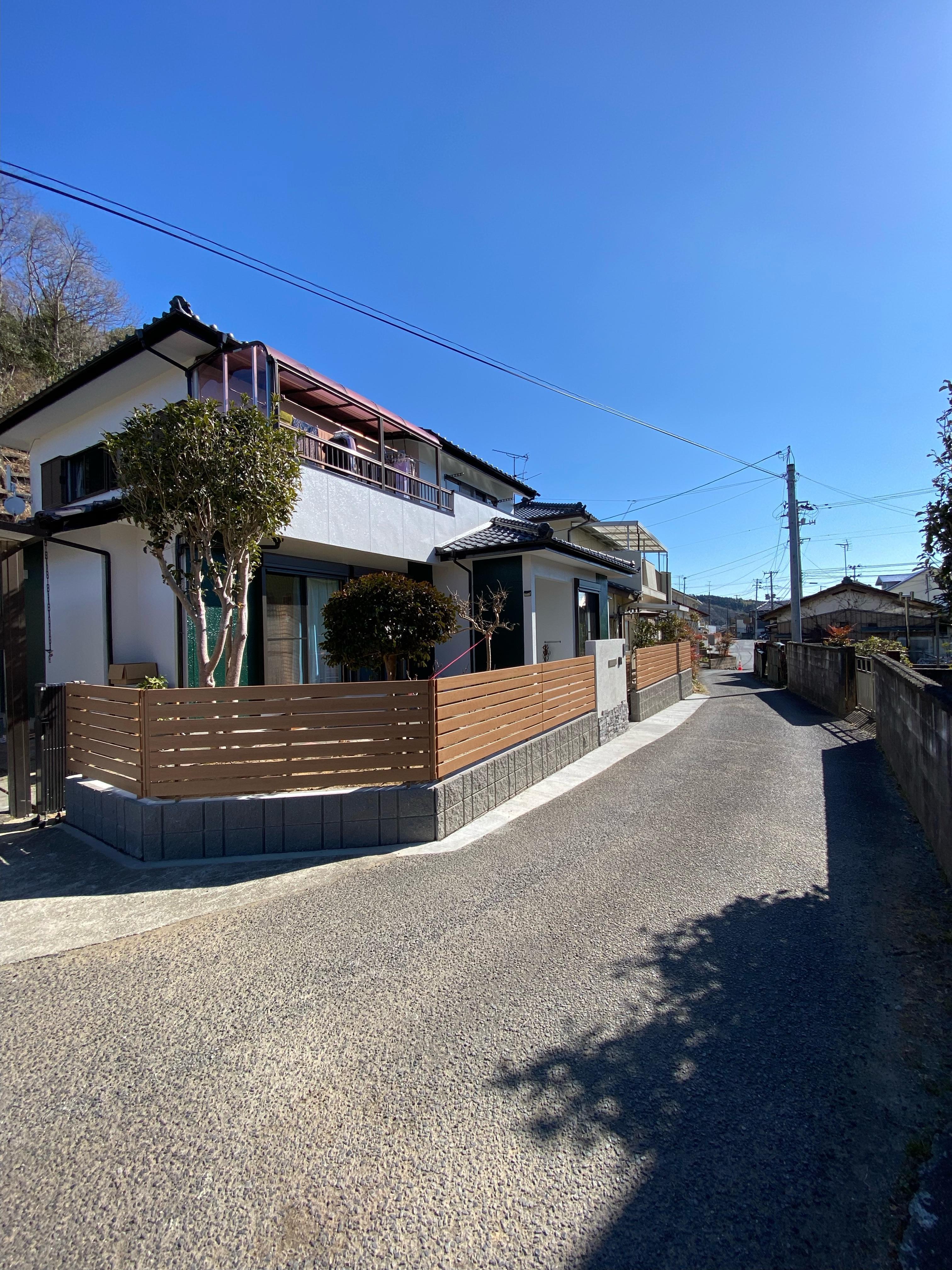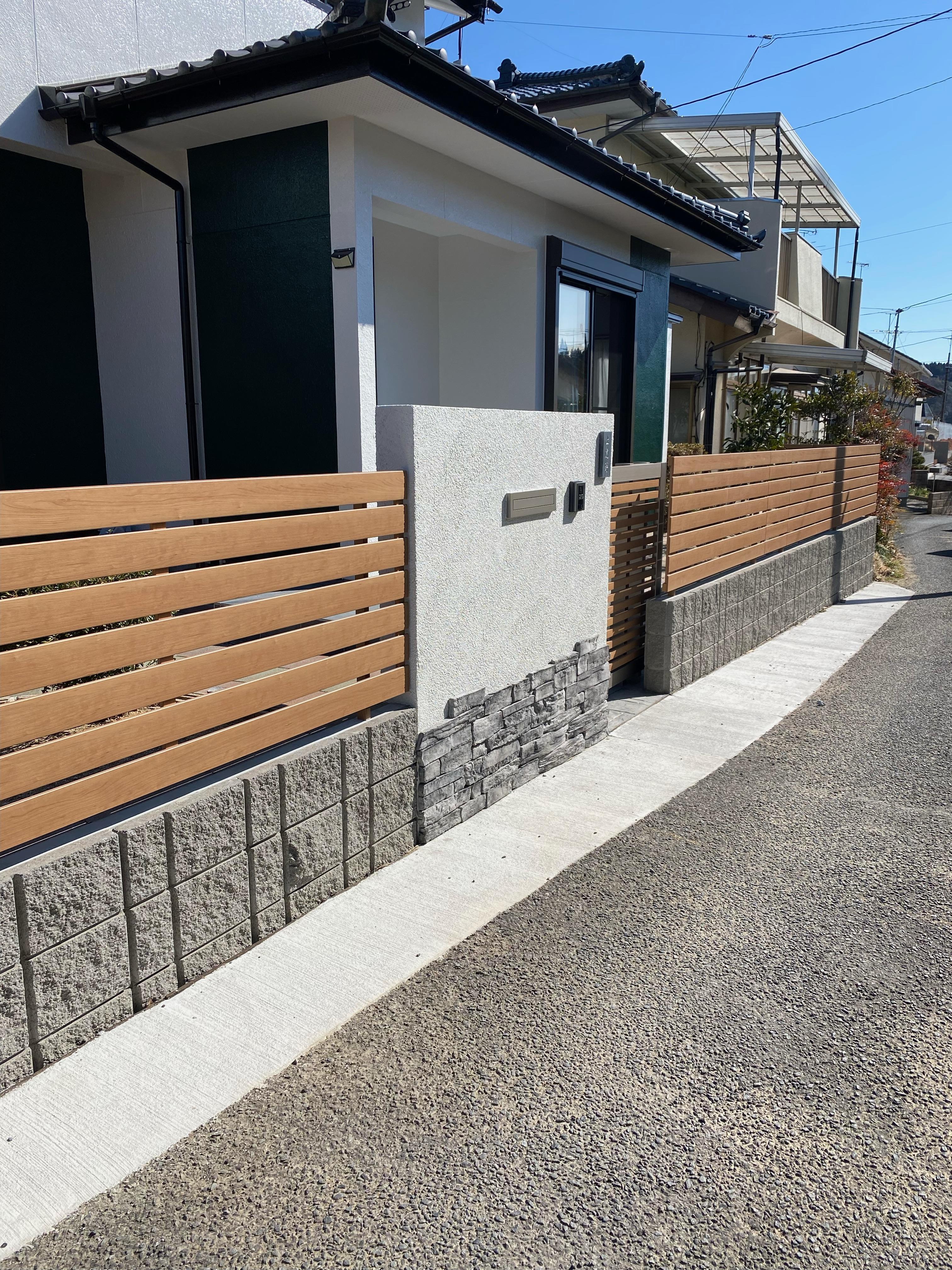 門柱にインターホンとポストを付け、スライド扉を設置しました。 スタンプコンクリートを使い、アクセントになっています。 リノベーションと同時に外構も行いました。