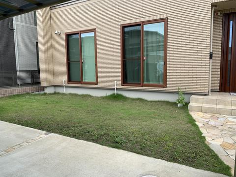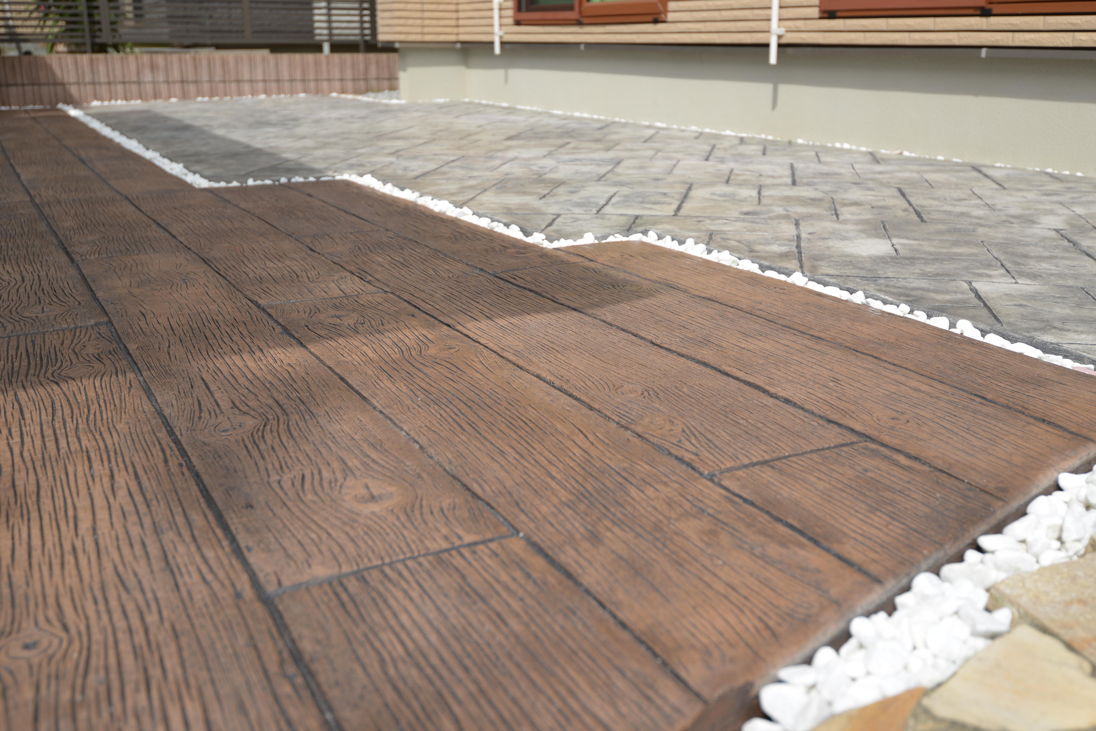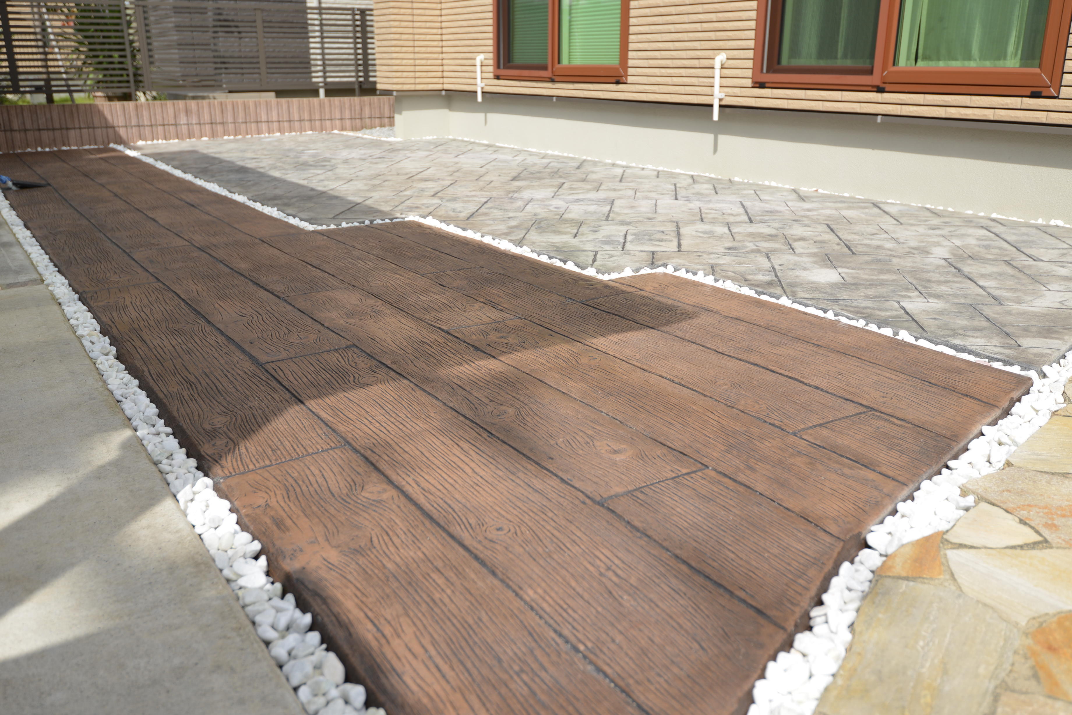 元は芝生のところを、クラフト人気のスタンプコンクリート施工 にしお手入れしやすいお庭になりました。 今回は2パターンの柄を使用しています。 クラフトはMATスタンプコンクリートの提携工務店です。 自信を持ってお勧めいたします。
