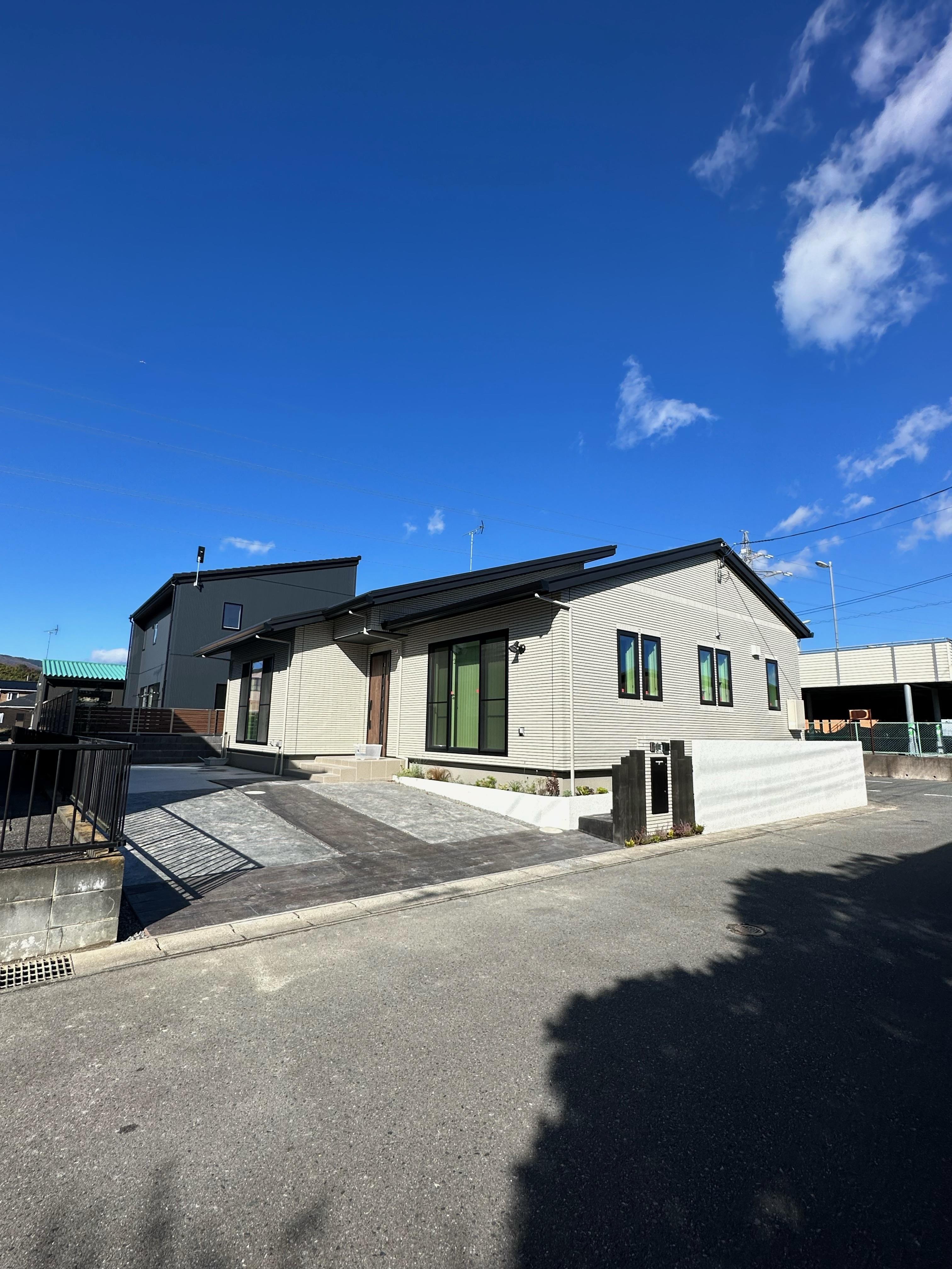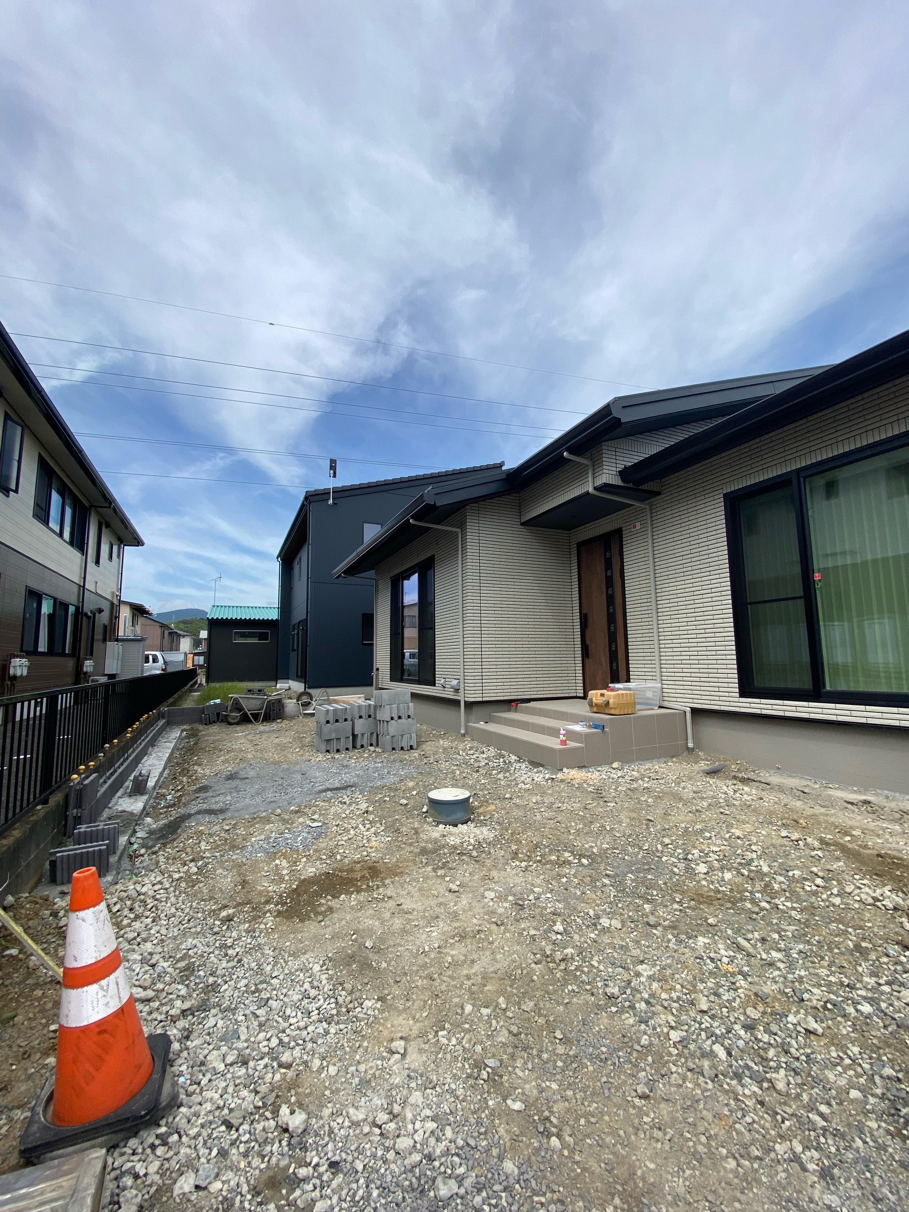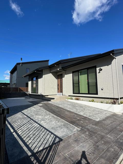 ブロック・フェンスだけでなく、外構全体をプロデュースさせて頂きました。 メインはMATスタンプコンクリートです。2パターンの柄を使って本物かと思わせるクオリティーです。 門柱は枕木を使い、正面の塀はホワイトの漆喰塗りになっています。
