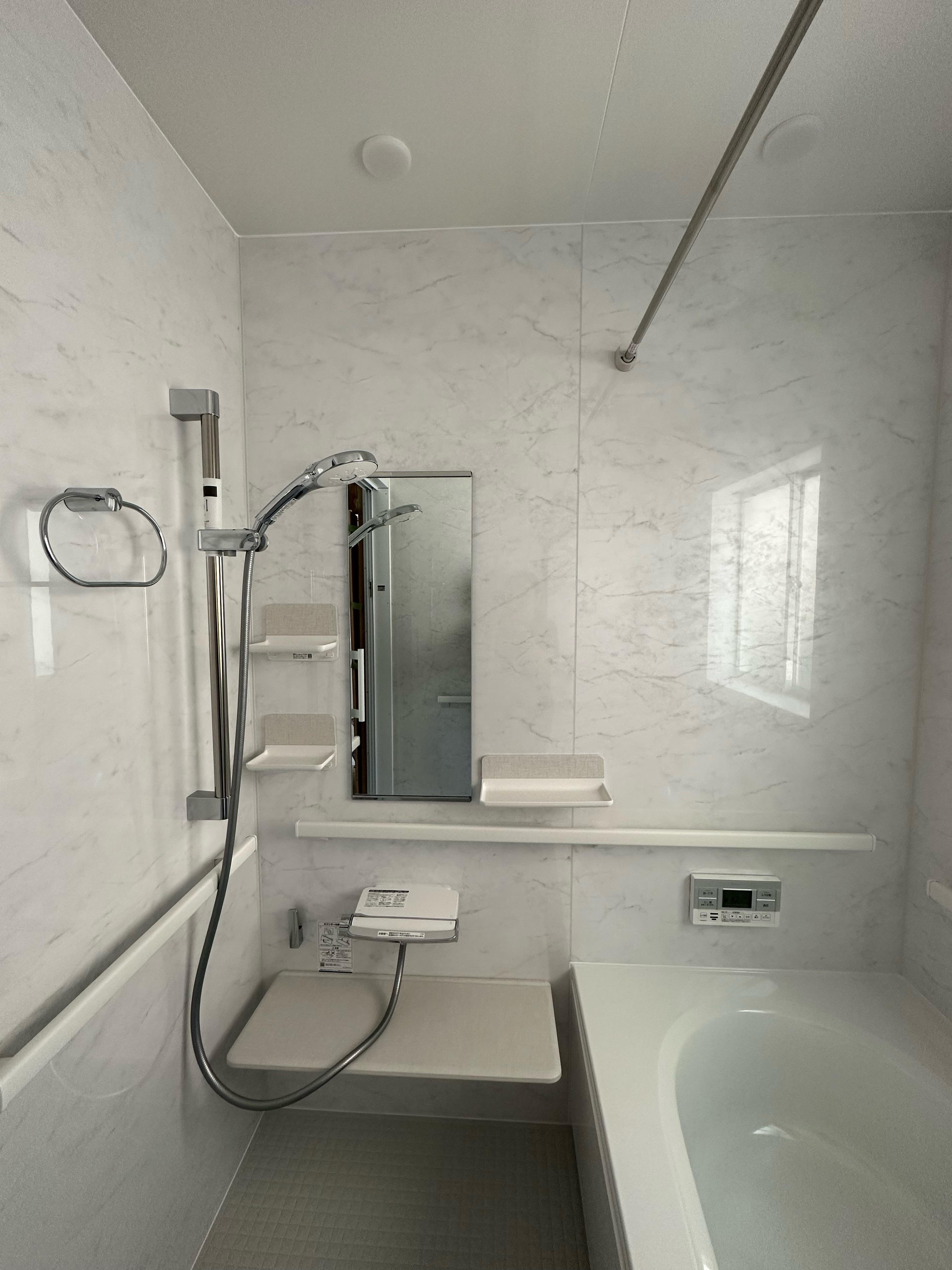 タイルのお風呂からLIXILシステムバスルーム「リデア」に交換です。 断熱効果であったかい浴室の完成です! 水栓は節湯水栓なので水道代の節約にもなります。 脱衣場と浴室の段差もなく段差解消されています。