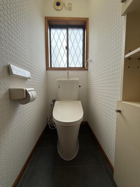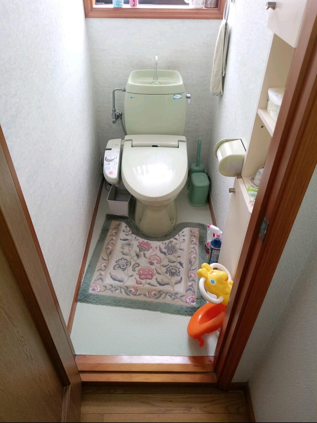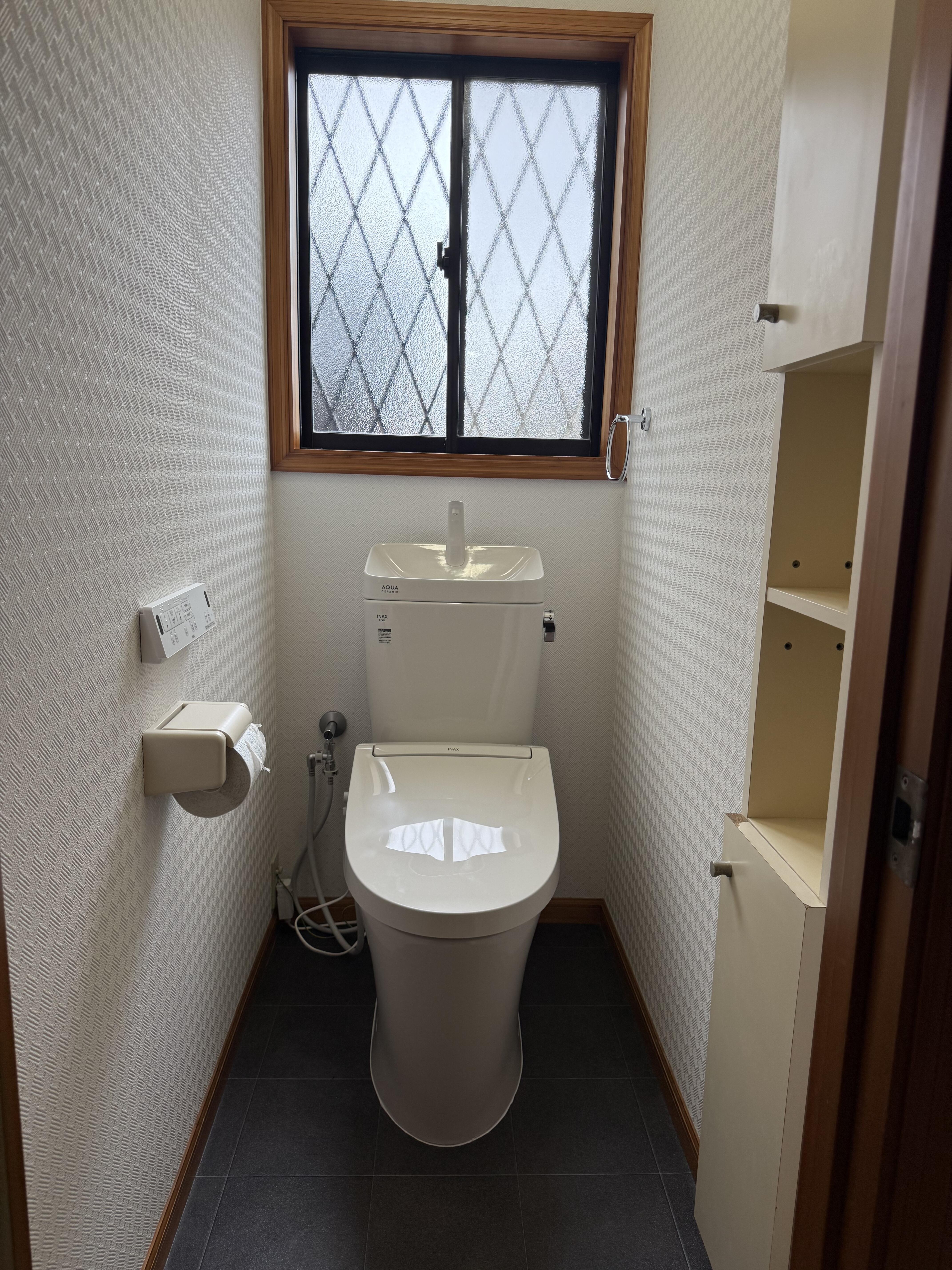 LIXILトイレ「アメージュ便器」に交換 同時にクッションフロアとクロスも交換しました 節水型トイレを選ぶことで水道代を減らすことができます 20年前と比べると1/3の水量で流れます 便器はアクアセラミックでできており、従来の陶器とは違い お掃除のしやすいトイレになっています