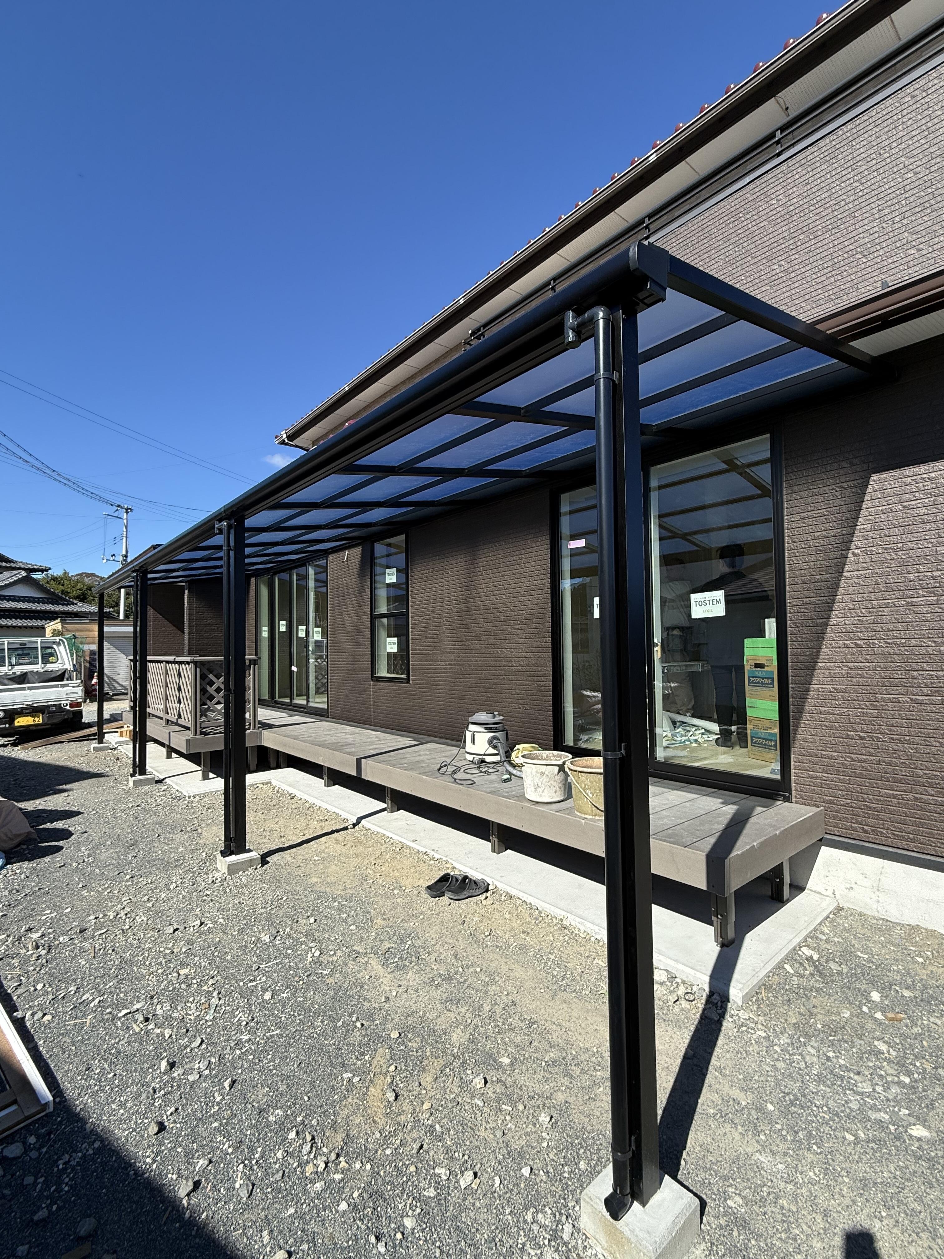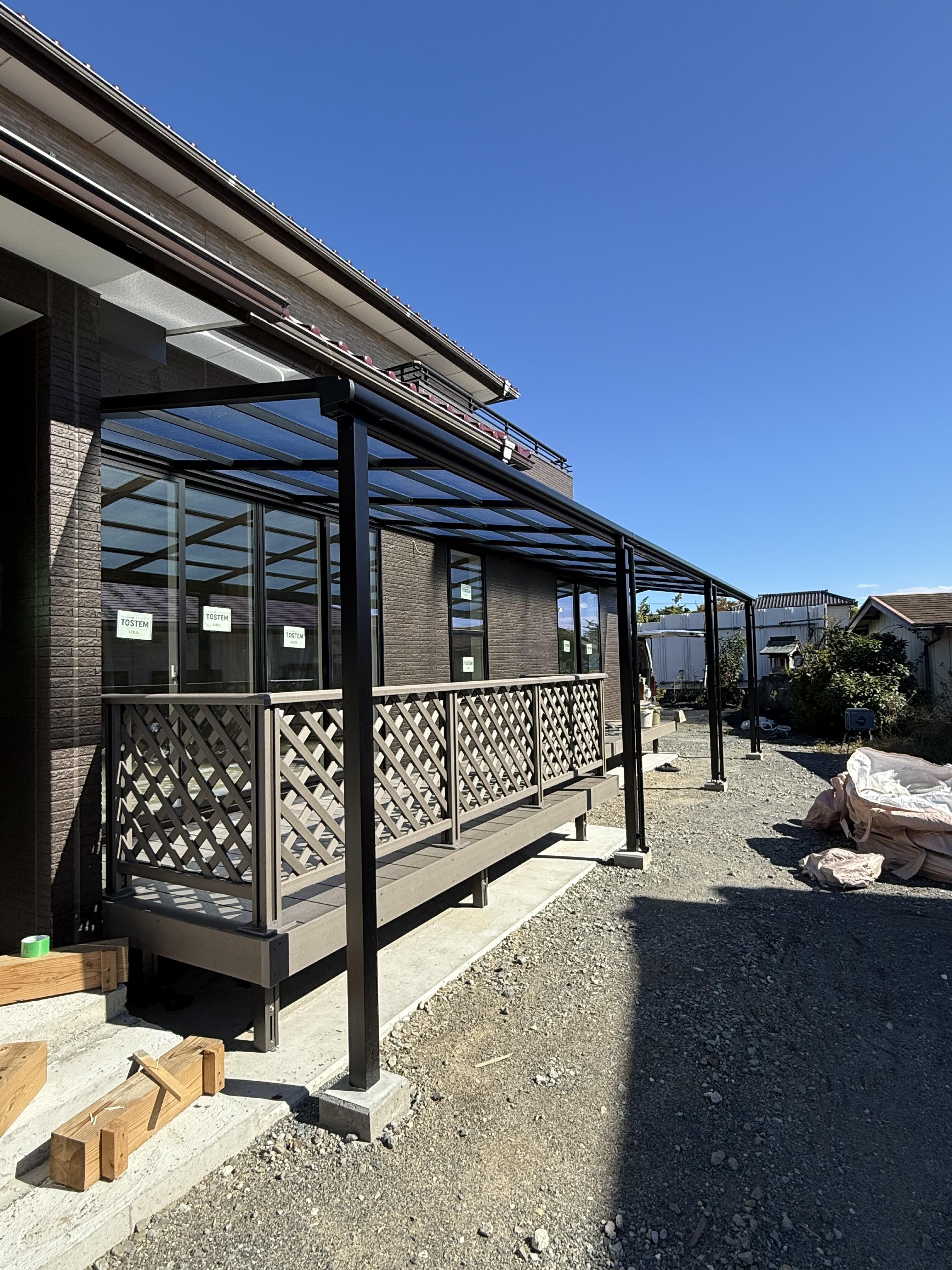 一部に設置してあったテラスとデッキを、玄関ドアのリフォームで位置変更をしたため、1階部分を通しで新たにテラスとデッキを設置しました。