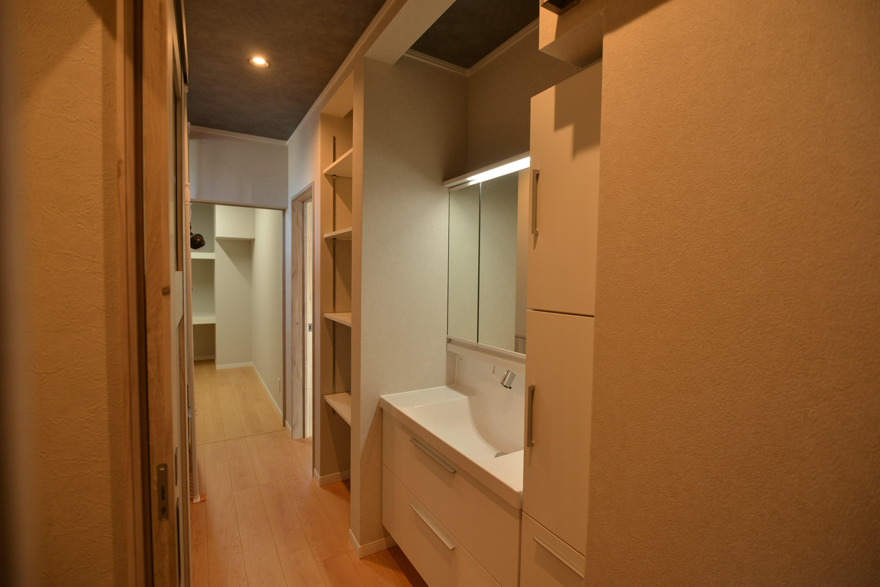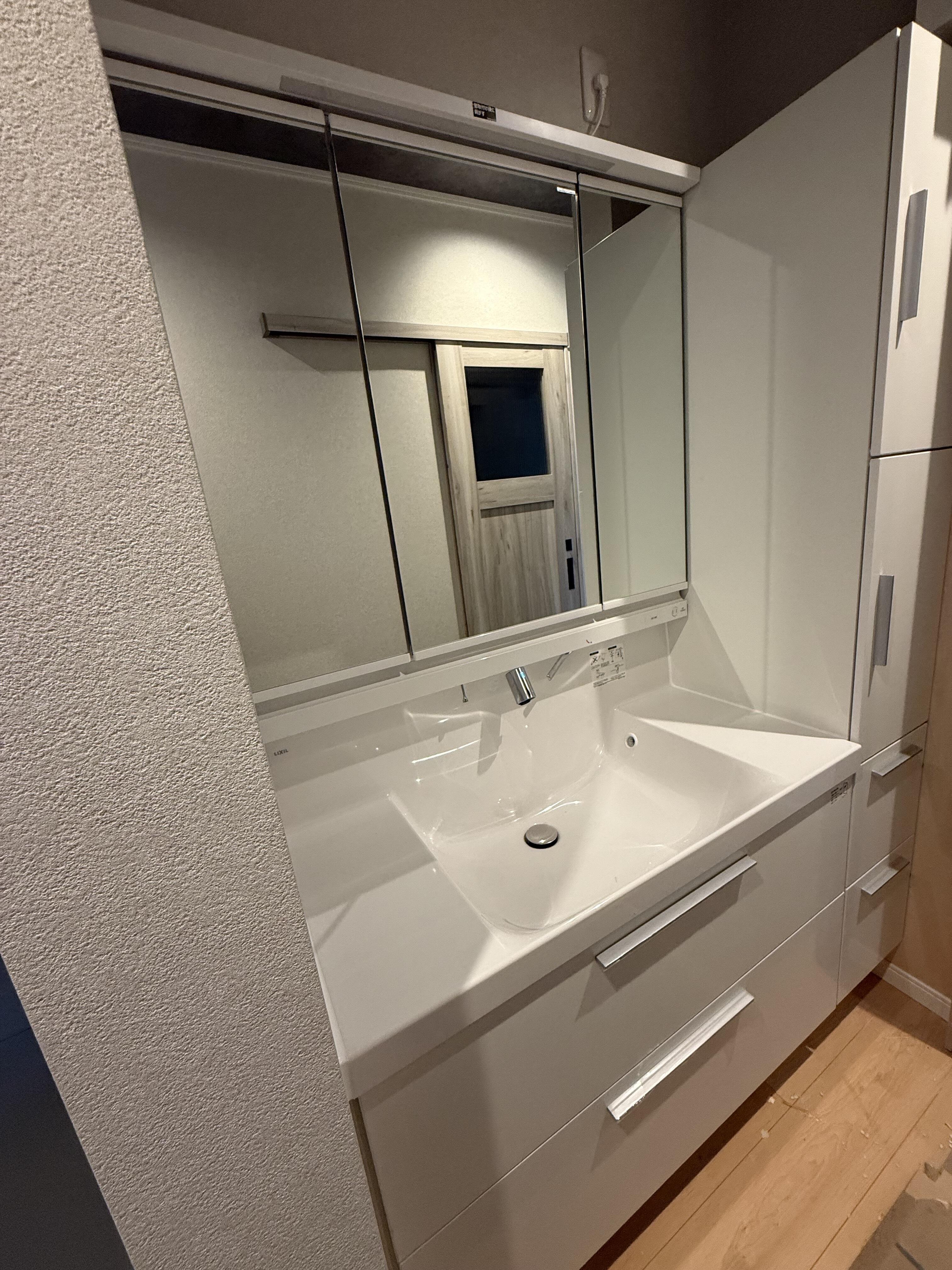 脱衣場にあった洗面化粧台を廊下に移設することによって、来客用としてもお使い頂け、お客様がプライベート空間に入ることなくご使用頂けます。 今回設置したのは、LIXIL洗面化粧台 クレヴィ です。サイドにも収納があり、水栓と本体が一体型になっているのが特徴です。