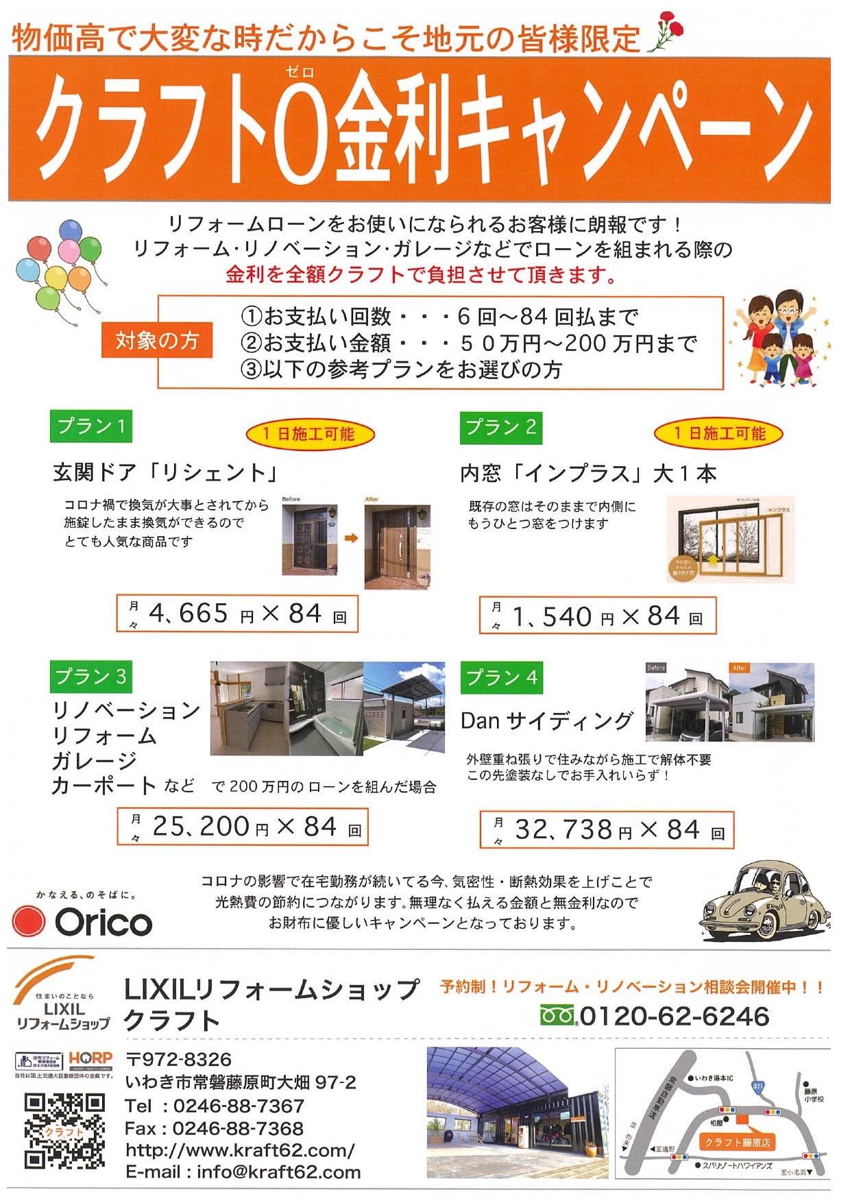 現在クラフトでは、オリコのLIXILリフォームローンをお使いの方の金利を全額負担する、