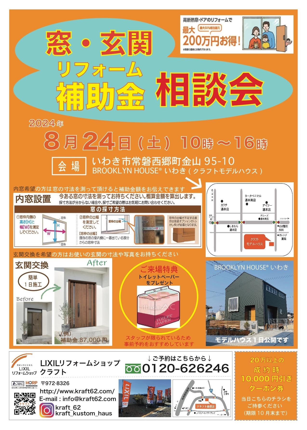 8月24日(土)10:00~16:00「窓・玄関ドア補助金リフォーム相談会」になります。