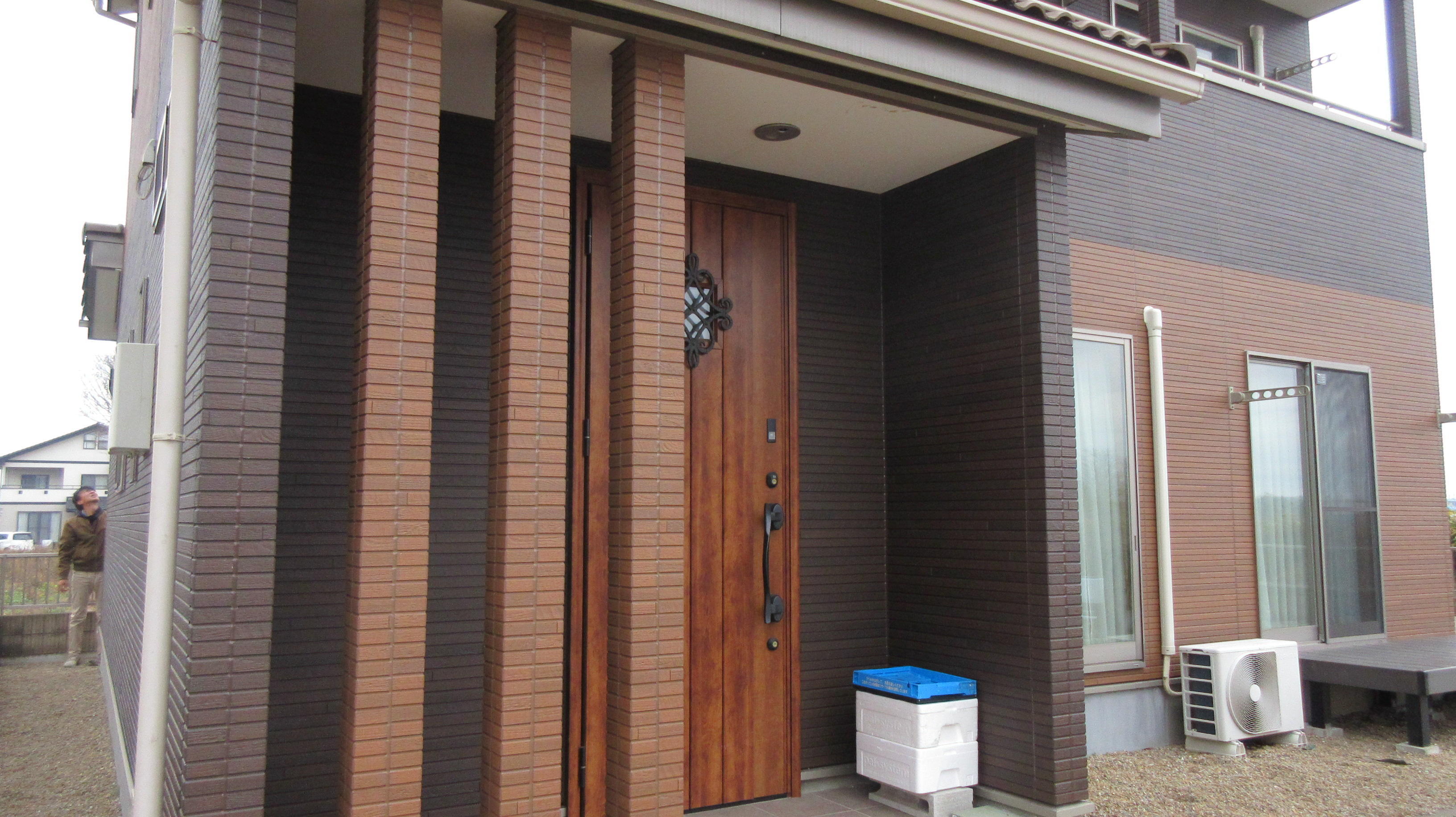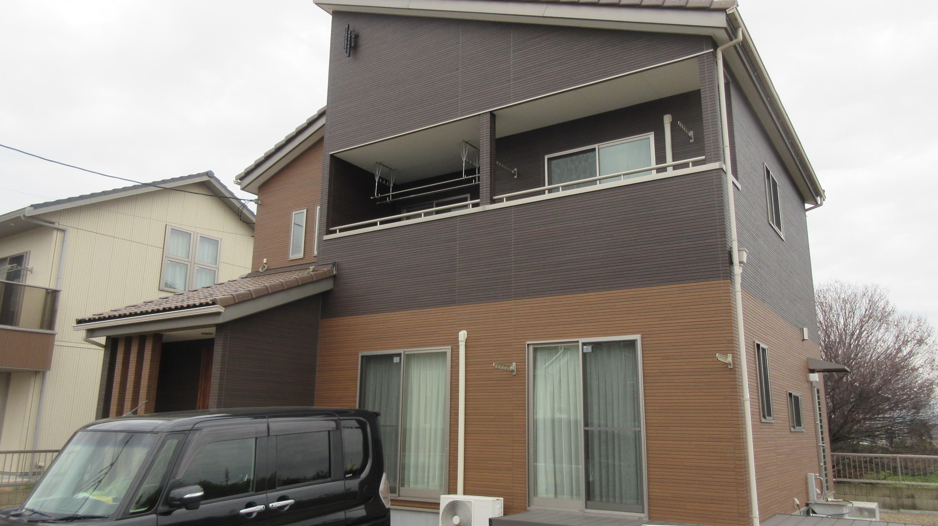 シックな色合いをお施主様が希望しており、今回LIXILのウッドラインという製品を使用しました。木目柄の外壁で色はラインダークブラウンとラインミドルブラウンです。