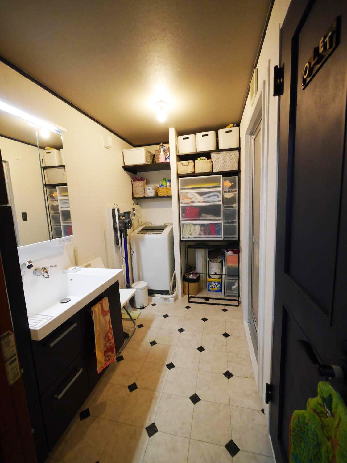 LIXILのピアラを採用。横の間仕切り壁を撤去して、洗面室の奥と洗濯機上部には可動式の棚板を取付けスッキリと片付ける事ができるようになりました。