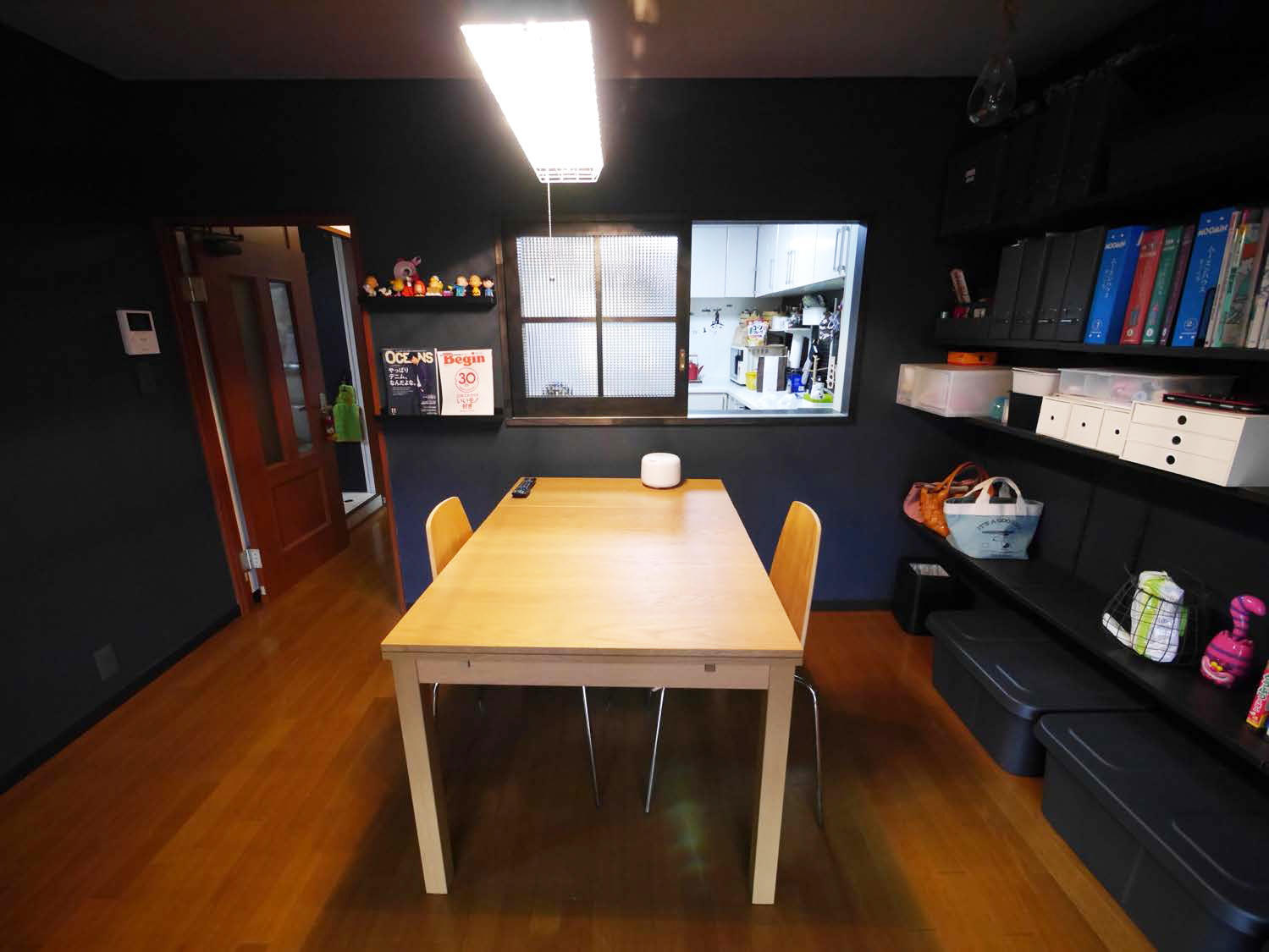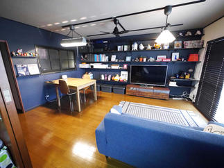 リビングの壁には可動式の棚板を一面に取り付けて”観せる”収納にリフォーム。クロスには濃いめのブルーを3面に貼り落ち着いた仕上がりになりました。照明はライティングレールをH型に取り付けてあります。