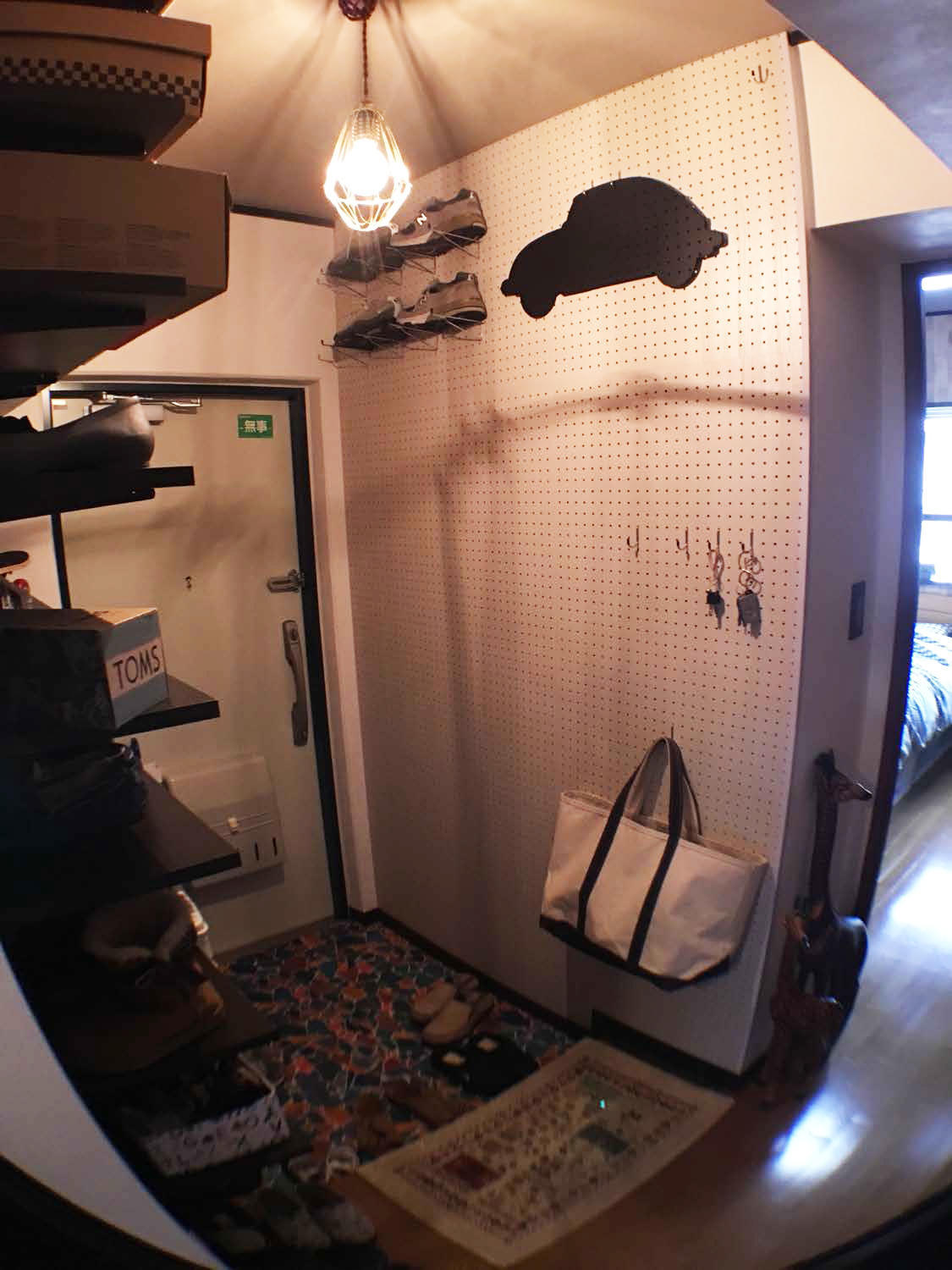 普通の下駄箱を、こちらにも可動式の棚板を付け解放感のある収納にしました。向かいの面には有孔ボードを一面に使い、キーやバッグ等の収納に利用できるように、