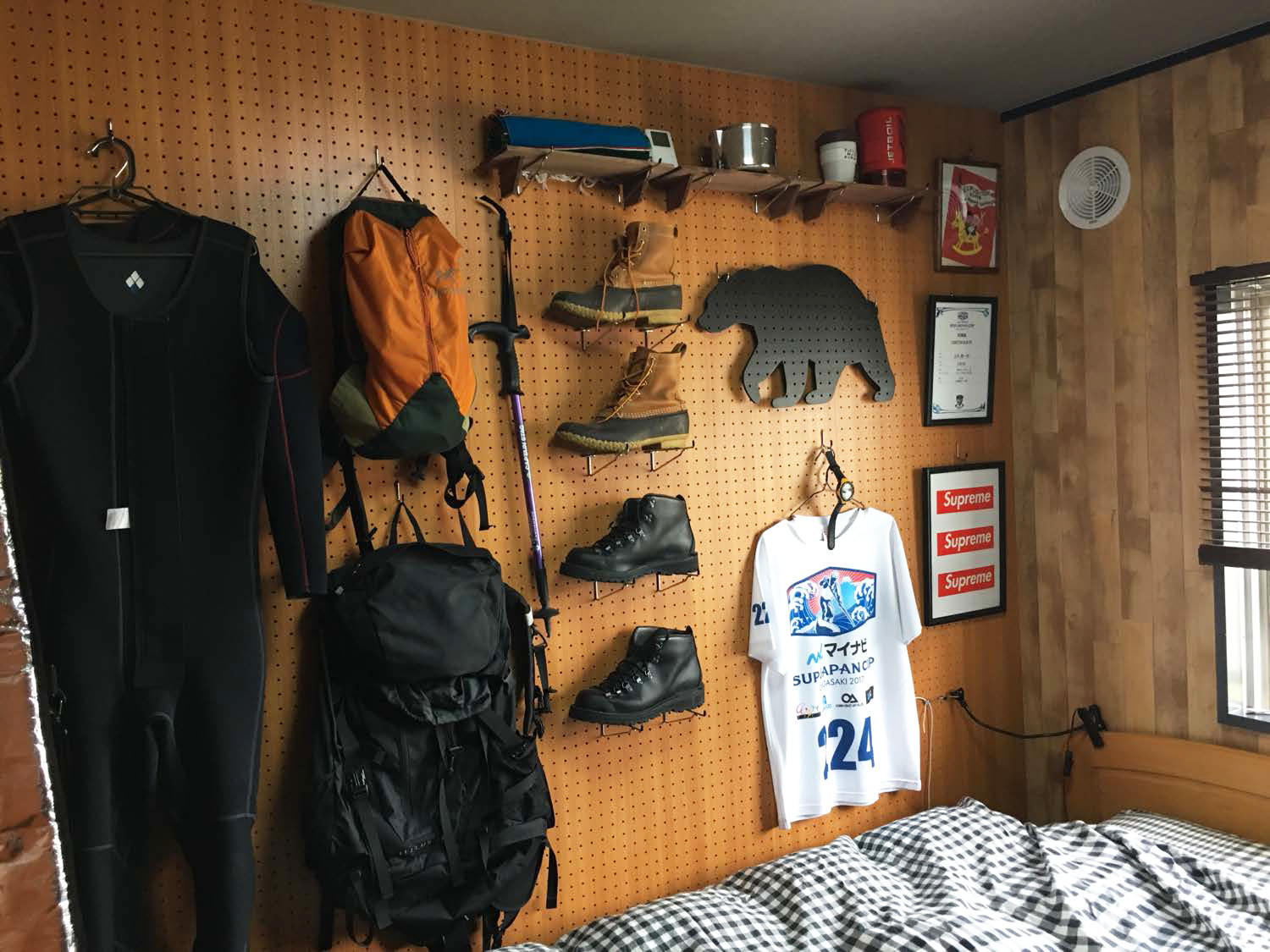 壁に有孔ボードを貼り、こちらも”観せる”収納にしました。穴あきボードなので自由に棚やフック等付けることができます。