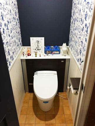 トイレにはLIXILのリフォレを採用しました。側面には奥様の好きなムーミンのクロスを。正面にはムーミンのグッズを置き完成です。