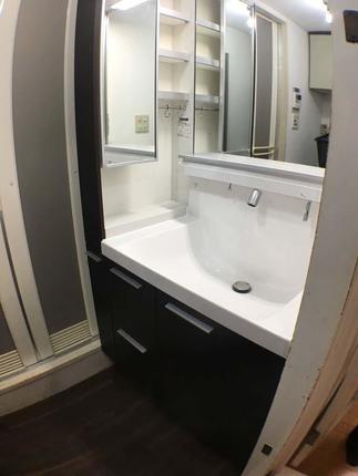 洗面台はLIXILのLC 75cm に15cm のトールキャビネットを入れ、収納力アップ。ぴったりのサイズに収める事ができました。扉の色は リフォレの扉と統一したクリエダークを採用。床などもダーク系のフローリング調のクションフロアーを貼りました。洗面台の形が高機能な現代風になりましたね。