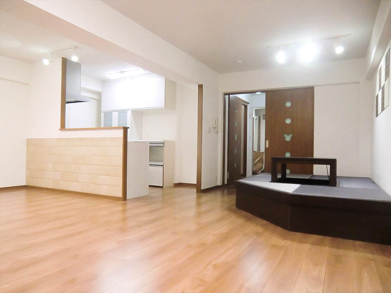 和室をなくしたということもあり、収納スペースのある置き畳を設置。スポットライトで照らす事でゴージャスに。壁にはアクセントでエコカラットを貼りました。和室のかわりというだけでなく、オシャレで機能性の高い空間になりました。